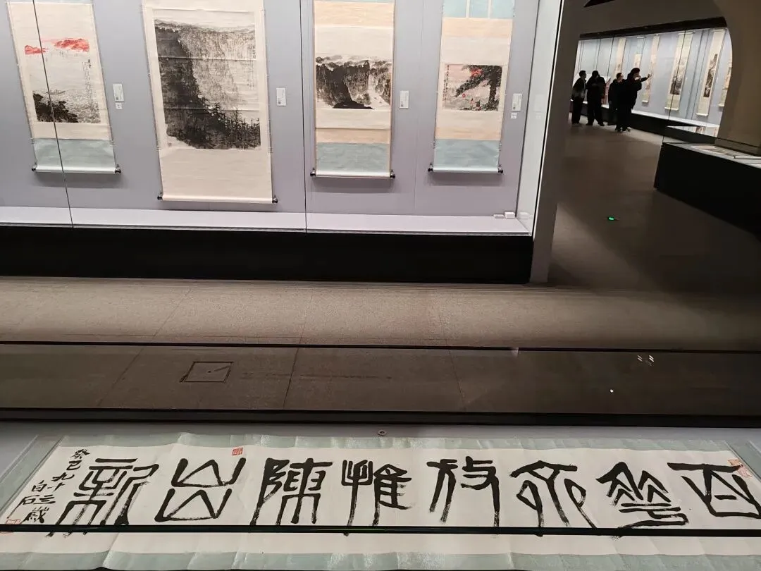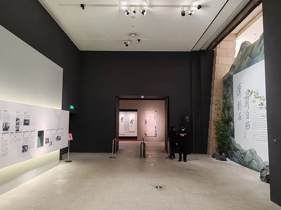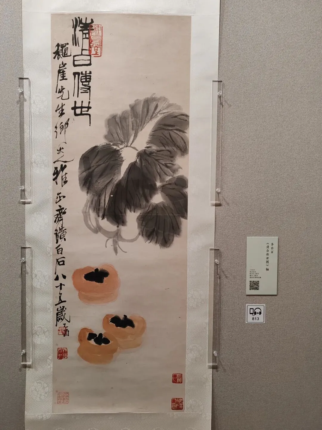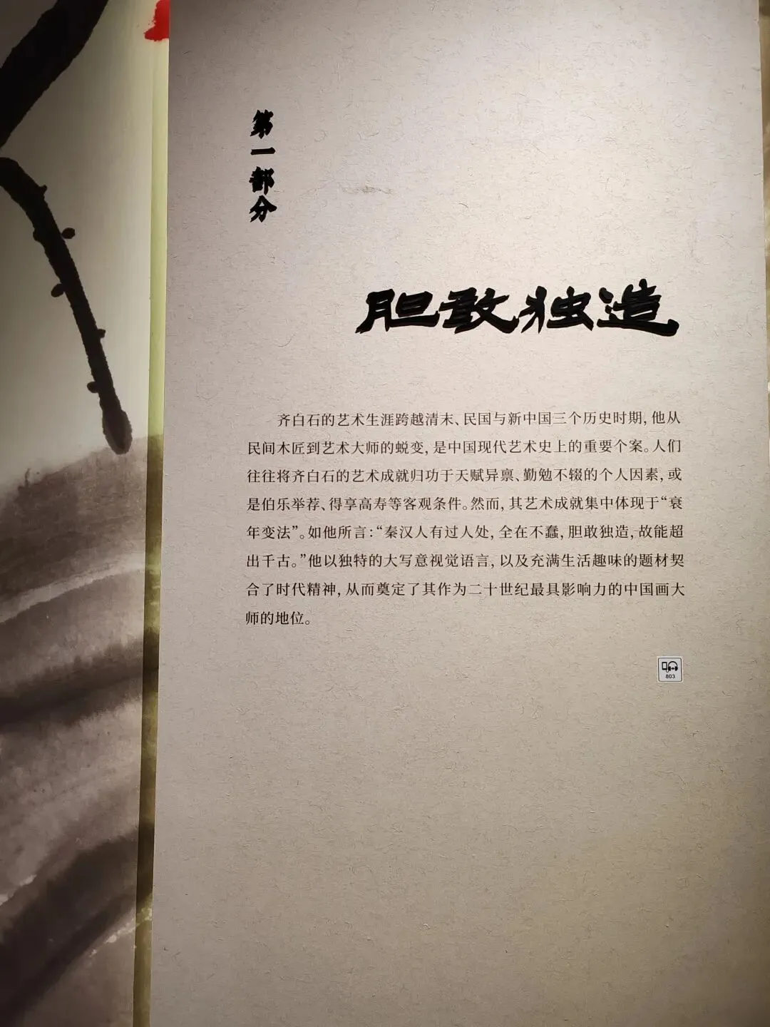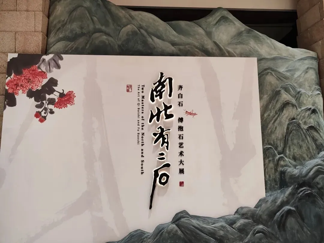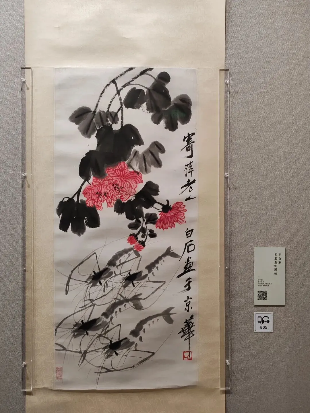 走在街上,微冷。商贩们,早早地就摆开摊位,艰难地招揽着生意。 在东风路与德雅路的十字路口,远远地,可以看到常绿行道树后,露出了湘博半遮半掩的侧脸。 小小的孩童,坐在手推车上,和我们一起等着红灯,准备过马路。 进了湘博,现在楼上往外看,是鲜活的当下,21世纪的长沙和中国。 在一楼的北侧,就可以看到《南北有“二石”》的巨型宣传立牌。 在展厅的门口,从左往右,就立着三块形状各一的立牌。 序厅是开放型的,没有买票的观众,也能够看到展览的序言:“二石”艺术年表。 把齐白石和傅抱石两位20世纪最伟大的两位中国画家放在一起比较展出,这应该是第一次。 把他们放在一起展出的逻辑,是他们都是20世纪中国画创新,贡献最卓著的几位大家之一。 在上个世纪,在中国画创新上面,能与他们并肩的,大概只有吴昌硕、张大千、徐悲鸿和黄永玉等寥寥数人。 讲的是白石老人“衰年变法”的历程和他的“红花墨叶”大写意花鸟画。 讲的是白石老人通过对前人的继承与扬弃,通过对自然与生活的观察,在构图与笔墨上多有变革,最后形成了他独特的富有生活气息与神韵的艺术表达。 在这一部分的结尾,有一个观众与AI进行互动的小环节。 这一部分,讲的是齐傅二人的篆刻艺术。展出的是他们的印章。 第三部分叫:《其命维新》。“其命维新”,是傅抱石的一枚印章。 所以,这一部分,是说的傅抱石的艺术创新活动与成就。 讲的是傅抱石独创“抱石皴”,从中国古人古诗、日本绘画和时代精神中创新山水画法的过程与成就。 这一部分是展示的傅抱石与齐白石在新中国成立后,与时俱进,进行创新的历程及成果。 最近几年,我也参观了二三十家博物馆。我发现湖南省博物馆有一个与众不同的特点,或者说优点。 就是,绝大多数的博物馆,不会凸显策展中的具体的工作人员,而只是让笼统的某某博物馆某某中心这个集体的名义出现在公众的面前。 但是湖南博物馆会把策展中的每一个工作人员的名字,展示在公众面前。个人的贡献与荣耀,领导和集体不会剥夺。 这是一个非常好的传统,折射出“眼睛中有人”的人文主义精神。 如果,能像其他博物馆一样,摆放一些蒲团或者坐垫就好了。 展厅的出口旁,有一个小小的文创商店,店子和商品,都很精致。 展厅中的插花,都还有点意思。都能与相关单元的意旨贴合。 观众们走在展厅里,也融入了展陈之中,变成了画中的人物。 我挑选了一些我喜欢且认为重要的展品,拍摄下来,列举如下: 艺术品,尤其是书法与绘画,是需要到现场揣摩原作的。