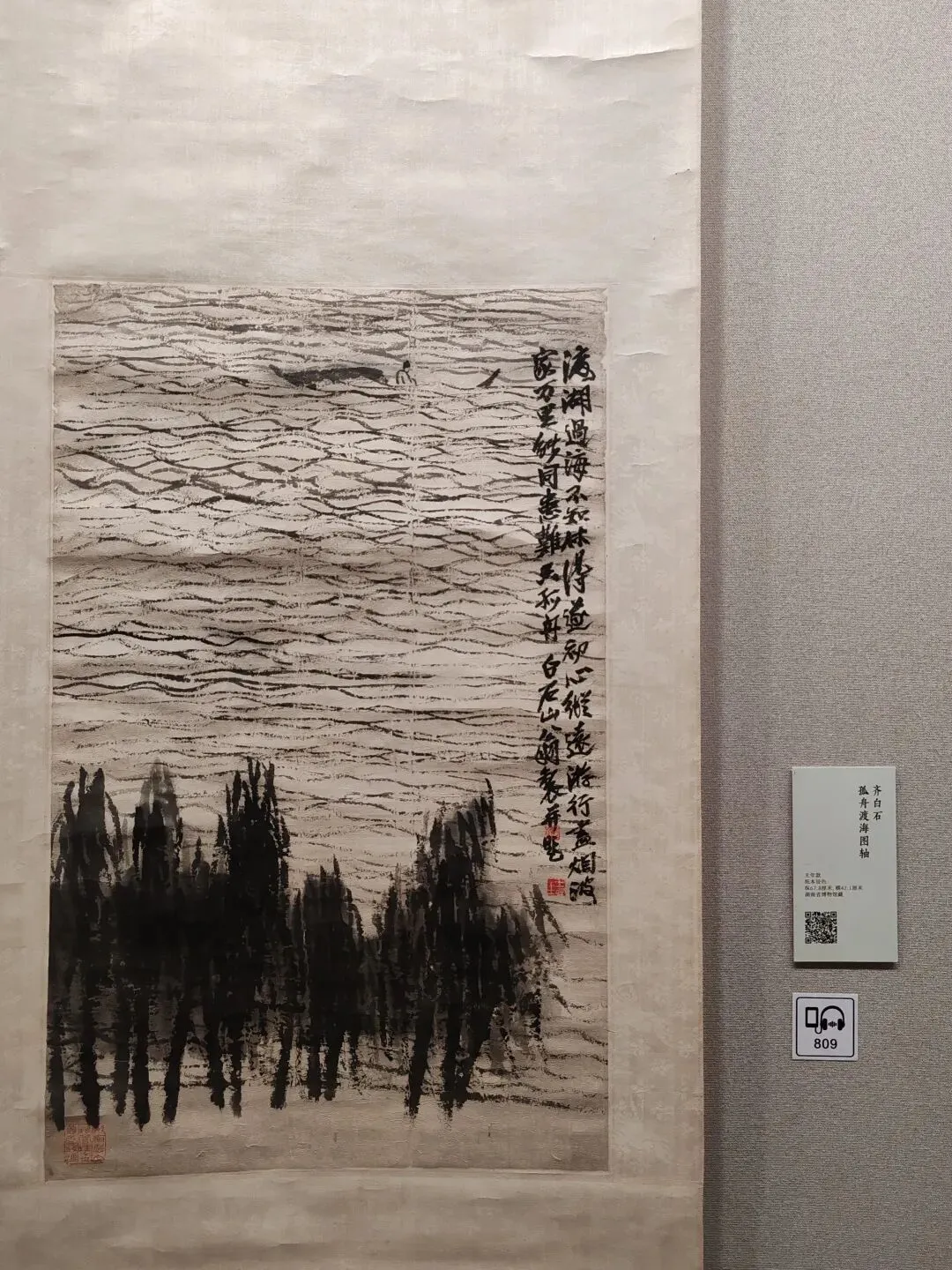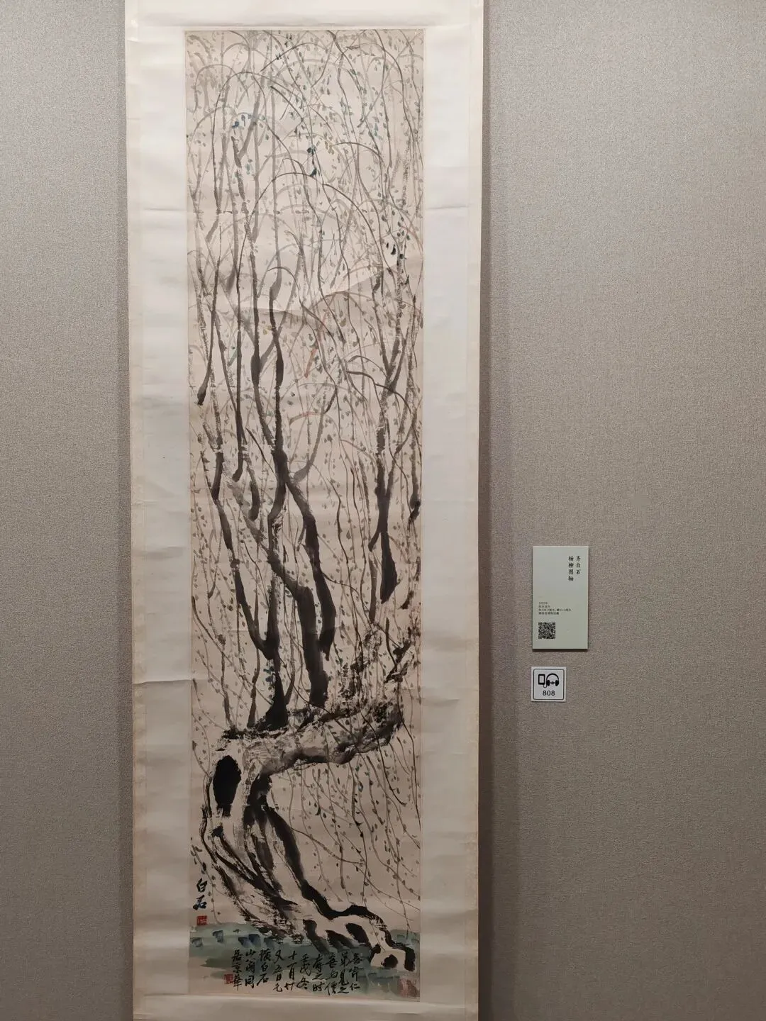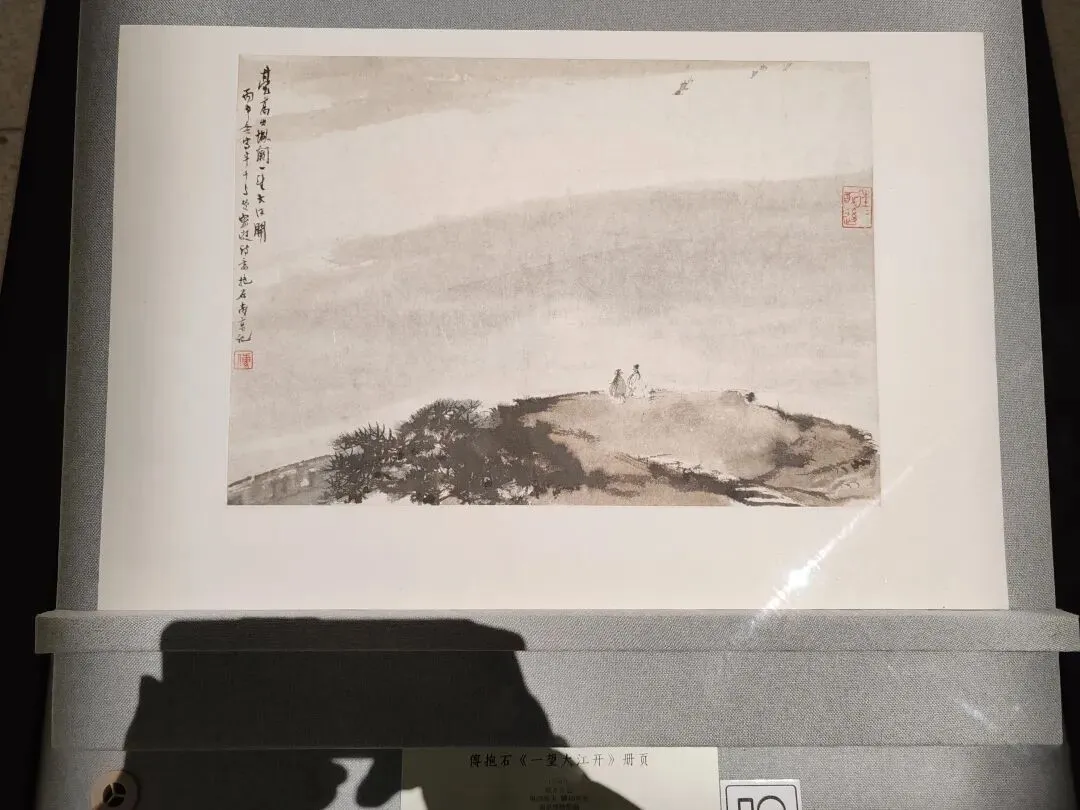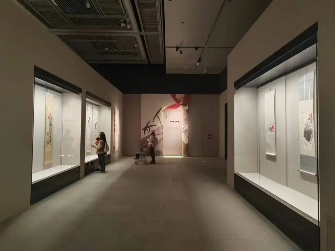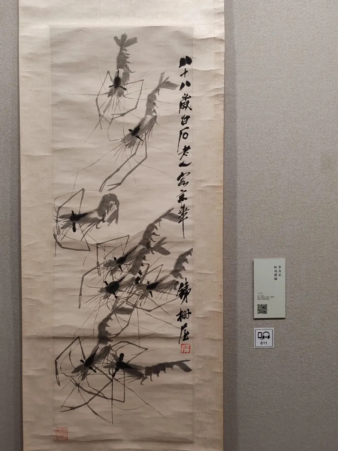 走在街上,微冷。商贩们,早早地就摆开摊位,艰难地招揽着生意。 在东风路与德雅路的十字路口,远远地,可以看到常绿行道树后,露出了湘博半遮半掩的侧脸。 小小的孩童,坐在手推车上,和我们一起等着红灯,准备过马路。 进了湘博,现在楼上往外看,是鲜活的当下,21世纪的长沙和中国。 在一楼的北侧,就可以看到《南北有“二石”》的巨型宣传立牌。 在展厅的门口,从左往右,就立着三块形状各一的立牌。 序厅是开放型的,没有买票的观众,也能够看到展览的序言:“二石”艺术年表。 把齐白石和傅抱石两位20世纪最伟大的两位中国画家放在一起比较展出,这应该是第一次。 把他们放在一起展出的逻辑,是他们都是20世纪中国画创新,贡献最卓著的几位大家之一。 在上个世纪,在中国画创新上面,能与他们并肩的,大概只有吴昌硕、张大千、徐悲鸿和黄永玉等寥寥数人。 讲的是白石老人“衰年变法”的历程和他的“红花墨叶”大写意花鸟画。 讲的是白石老人通过对前人的继承与扬弃,通过对自然与生活的观察,在构图与笔墨上多有变革,最后形成了他独特的富有生活气息与神韵的艺术表达。 在这一部分的结尾,有一个观众与AI进行互动的小环节。 这一部分,讲的是齐傅二人的篆刻艺术。展出的是他们的印章。 第三部分叫:《其命维新》。“其命维新”,是傅抱石的一枚印章。 所以,这一部分,是说的傅抱石的艺术创新活动与成就。 讲的是傅抱石独创“抱石皴”,从中国古人古诗、日本绘画和时代精神中创新山水画法的过程与成就。 这一部分是展示的傅抱石与齐白石在新中国成立后,与时俱进,进行创新的历程及成果。 最近几年,我也参观了二三十家博物馆。我发现湖南省博物馆有一个与众不同的特点,或者说优点。 就是,绝大多数的博物馆,不会凸显策展中的具体的工作人员,而只是让笼统的某某博物馆某某中心这个集体的名义出现在公众的面前。 但是湖南博物馆会把策展中的每一个工作人员的名字,展示在公众面前。个人的贡献与荣耀,领导和集体不会剥夺。 这是一个非常好的传统,折射出“眼睛中有人”的人文主义精神。 如果,能像其他博物馆一样,摆放一些蒲团或者坐垫就好了。 展厅的出口旁,有一个小小的文创商店,店子和商品,都很精致。 展厅中的插花,都还有点意思。都能与相关单元的意旨贴合。 观众们走在展厅里,也融入了展陈之中,变成了画中的人物。 我挑选了一些我喜欢且认为重要的展品,拍摄下来,列举如下: 艺术品,尤其是书法与绘画,是需要到现场揣摩原作的。