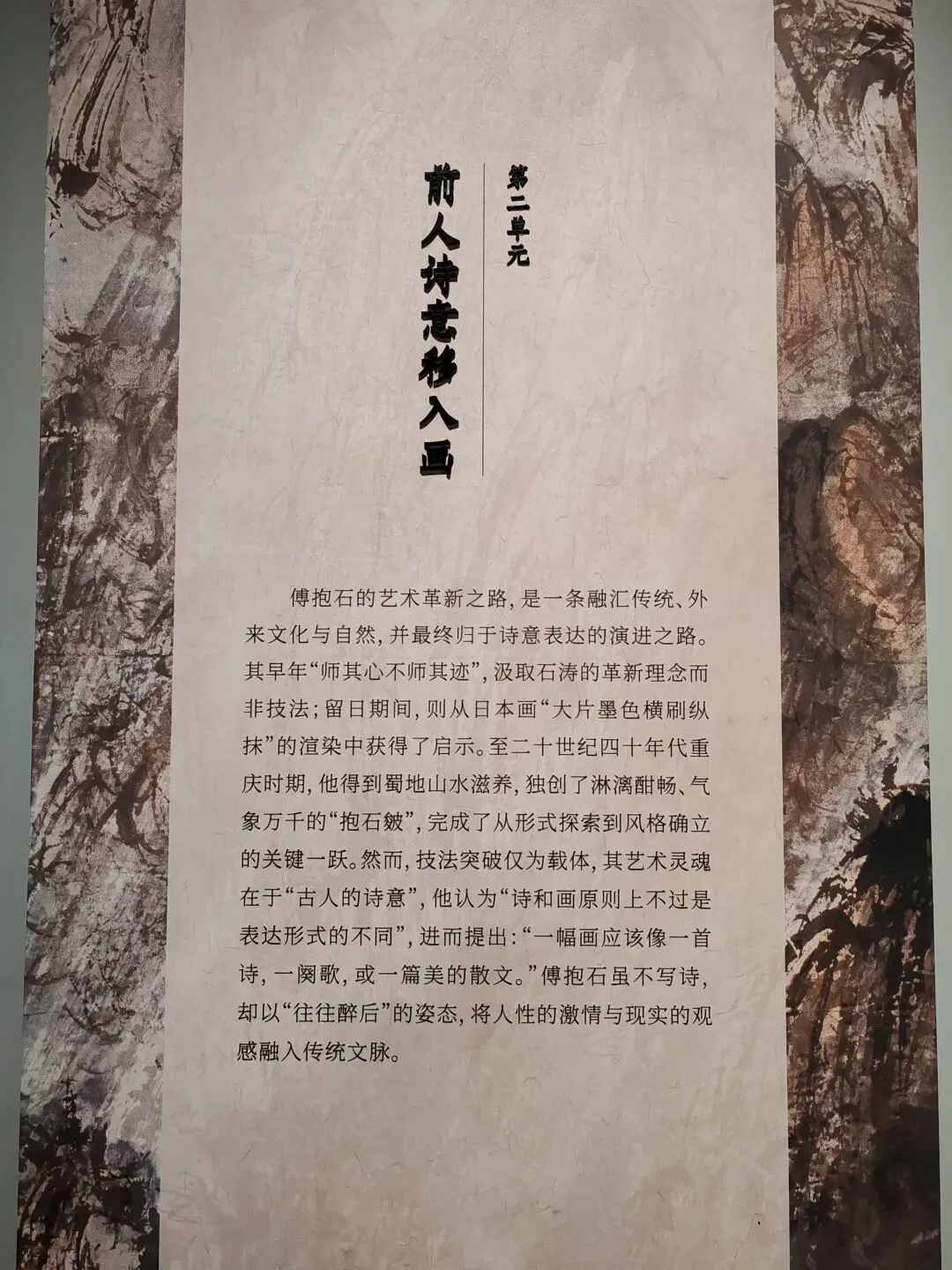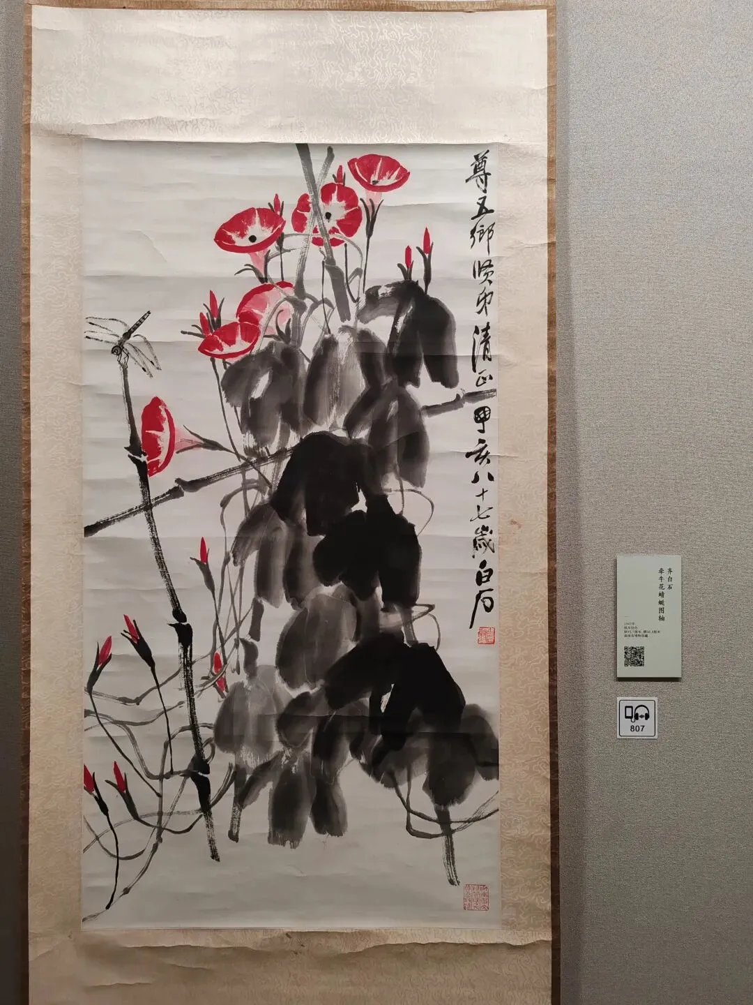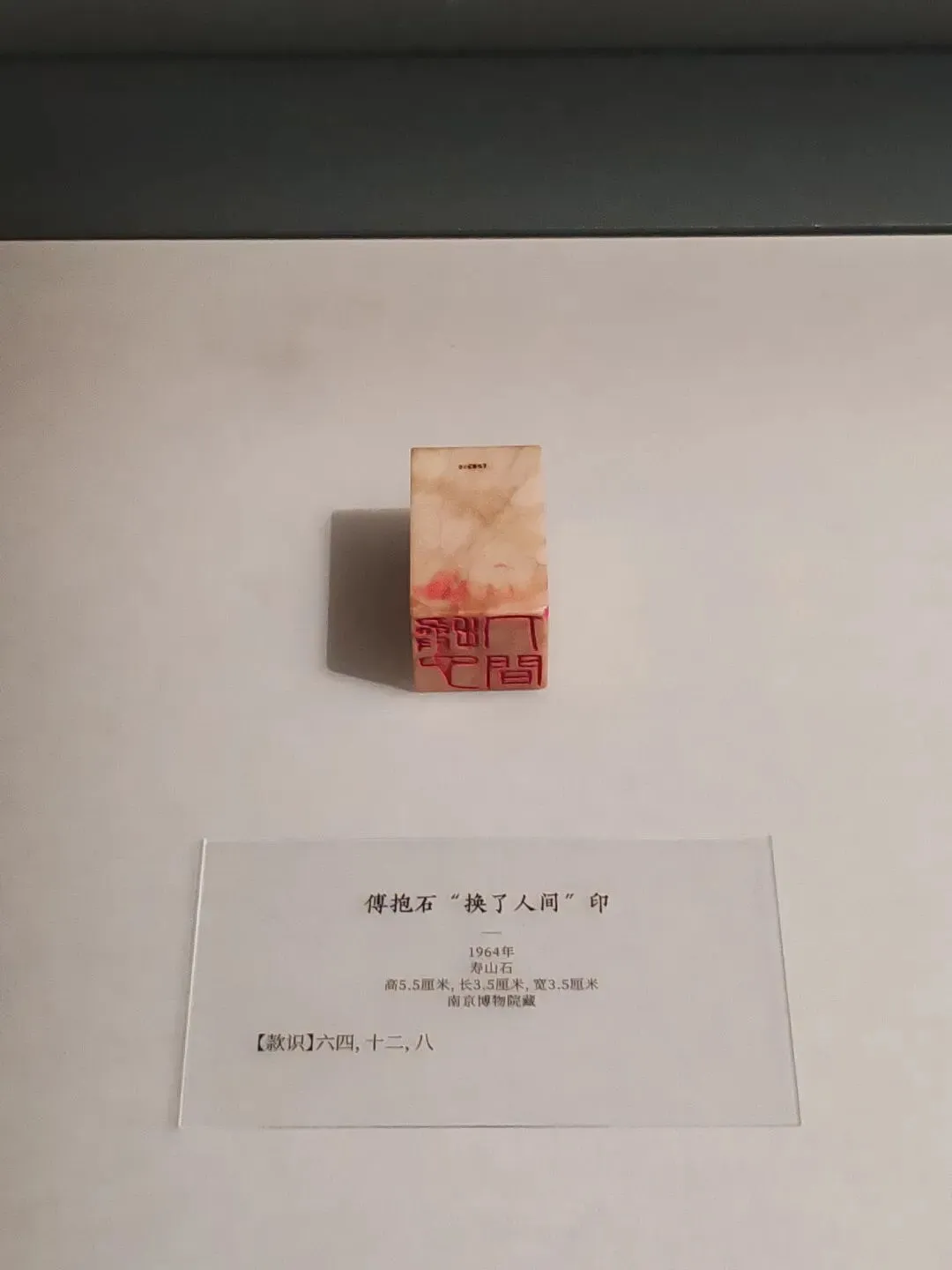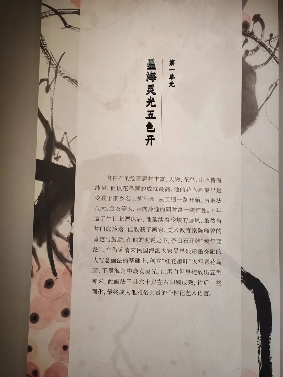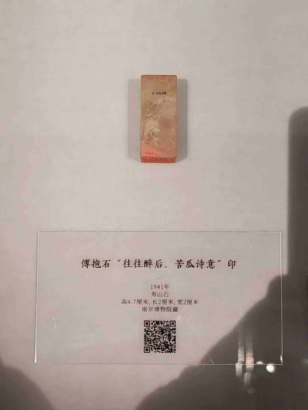 走在街上,微冷。商贩们,早早地就摆开摊位,艰难地招揽着生意。 在东风路与德雅路的十字路口,远远地,可以看到常绿行道树后,露出了湘博半遮半掩的侧脸。 小小的孩童,坐在手推车上,和我们一起等着红灯,准备过马路。 进了湘博,现在楼上往外看,是鲜活的当下,21世纪的长沙和中国。 在一楼的北侧,就可以看到《南北有“二石”》的巨型宣传立牌。 在展厅的门口,从左往右,就立着三块形状各一的立牌。 序厅是开放型的,没有买票的观众,也能够看到展览的序言:“二石”艺术年表。 把齐白石和傅抱石两位20世纪最伟大的两位中国画家放在一起比较展出,这应该是第一次。 把他们放在一起展出的逻辑,是他们都是20世纪中国画创新,贡献最卓著的几位大家之一。 在上个世纪,在中国画创新上面,能与他们并肩的,大概只有吴昌硕、张大千、徐悲鸿和黄永玉等寥寥数人。 讲的是白石老人“衰年变法”的历程和他的“红花墨叶”大写意花鸟画。 讲的是白石老人通过对前人的继承与扬弃,通过对自然与生活的观察,在构图与笔墨上多有变革,最后形成了他独特的富有生活气息与神韵的艺术表达。 在这一部分的结尾,有一个观众与AI进行互动的小环节。 这一部分,讲的是齐傅二人的篆刻艺术。展出的是他们的印章。 第三部分叫:《其命维新》。“其命维新”,是傅抱石的一枚印章。 所以,这一部分,是说的傅抱石的艺术创新活动与成就。 讲的是傅抱石独创“抱石皴”,从中国古人古诗、日本绘画和时代精神中创新山水画法的过程与成就。 这一部分是展示的傅抱石与齐白石在新中国成立后,与时俱进,进行创新的历程及成果。 最近几年,我也参观了二三十家博物馆。我发现湖南省博物馆有一个与众不同的特点,或者说优点。 就是,绝大多数的博物馆,不会凸显策展中的具体的工作人员,而只是让笼统的某某博物馆某某中心这个集体的名义出现在公众的面前。 但是湖南博物馆会把策展中的每一个工作人员的名字,展示在公众面前。个人的贡献与荣耀,领导和集体不会剥夺。 这是一个非常好的传统,折射出“眼睛中有人”的人文主义精神。 如果,能像其他博物馆一样,摆放一些蒲团或者坐垫就好了。 展厅的出口旁,有一个小小的文创商店,店子和商品,都很精致。 展厅中的插花,都还有点意思。都能与相关单元的意旨贴合。 观众们走在展厅里,也融入了展陈之中,变成了画中的人物。 我挑选了一些我喜欢且认为重要的展品,拍摄下来,列举如下: 艺术品,尤其是书法与绘画,是需要到现场揣摩原作的。