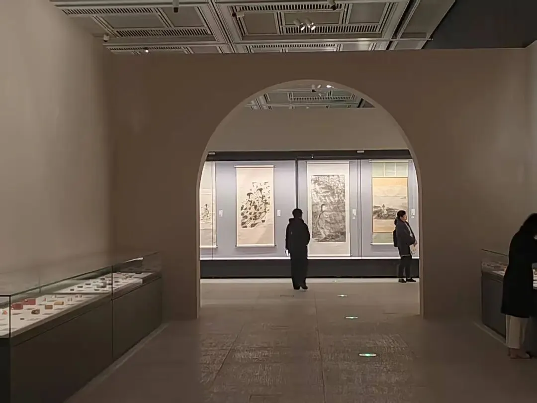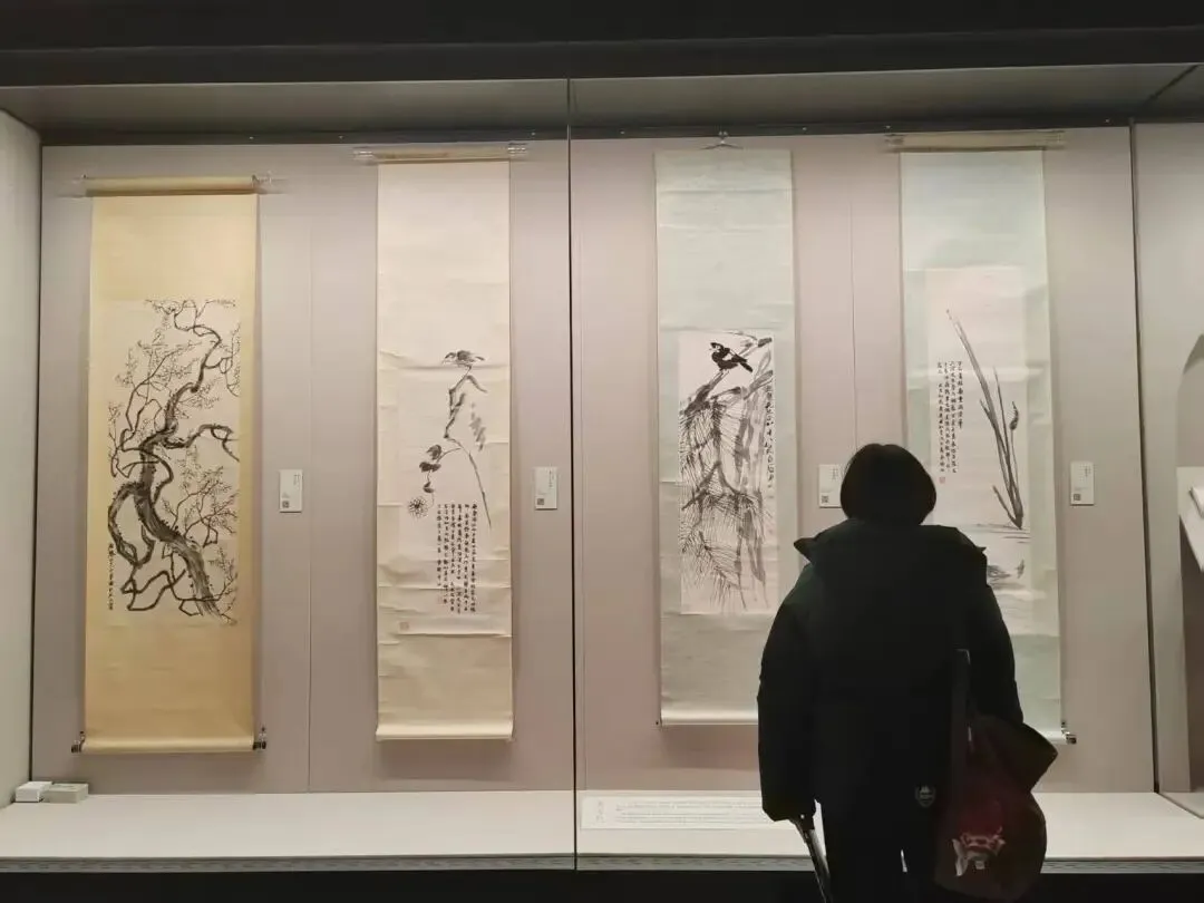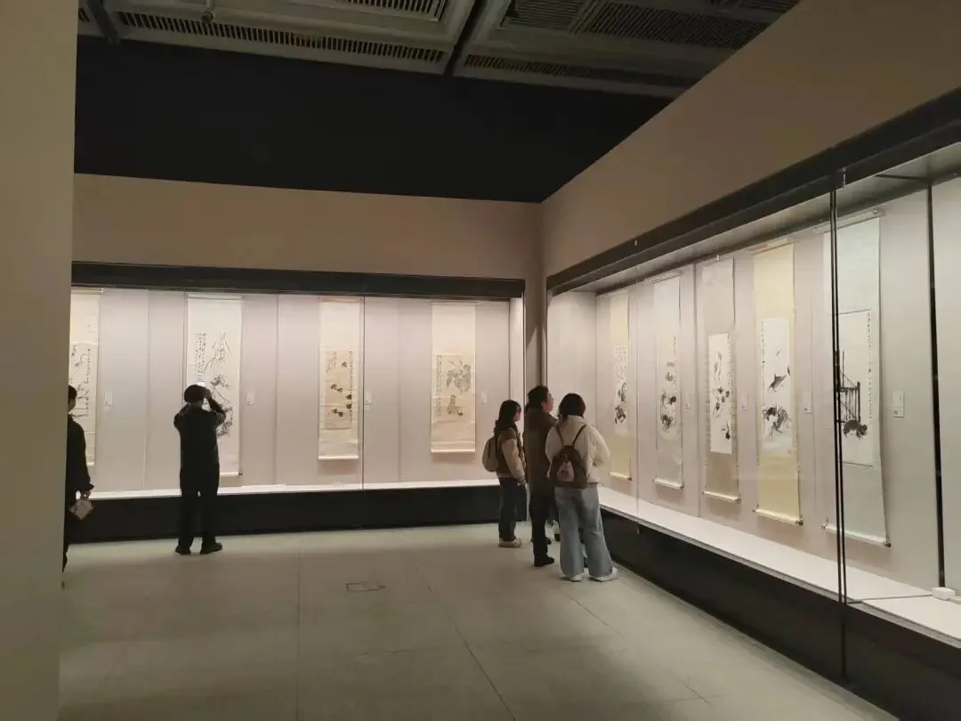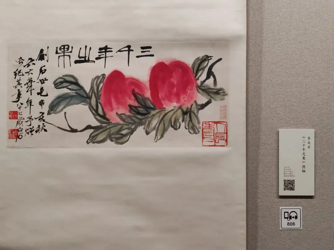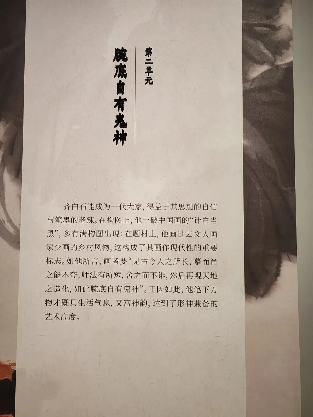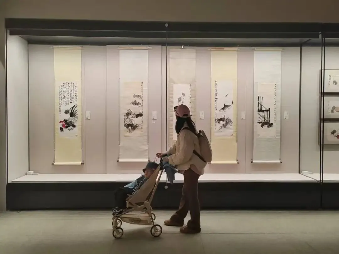 走在街上,微冷。商贩们,早早地就摆开摊位,艰难地招揽着生意。 在东风路与德雅路的十字路口,远远地,可以看到常绿行道树后,露出了湘博半遮半掩的侧脸。 小小的孩童,坐在手推车上,和我们一起等着红灯,准备过马路。 进了湘博,现在楼上往外看,是鲜活的当下,21世纪的长沙和中国。 在一楼的北侧,就可以看到《南北有“二石”》的巨型宣传立牌。 在展厅的门口,从左往右,就立着三块形状各一的立牌。 序厅是开放型的,没有买票的观众,也能够看到展览的序言:“二石”艺术年表。 把齐白石和傅抱石两位20世纪最伟大的两位中国画家放在一起比较展出,这应该是第一次。 把他们放在一起展出的逻辑,是他们都是20世纪中国画创新,贡献最卓著的几位大家之一。 在上个世纪,在中国画创新上面,能与他们并肩的,大概只有吴昌硕、张大千、徐悲鸿和黄永玉等寥寥数人。 讲的是白石老人“衰年变法”的历程和他的“红花墨叶”大写意花鸟画。 讲的是白石老人通过对前人的继承与扬弃,通过对自然与生活的观察,在构图与笔墨上多有变革,最后形成了他独特的富有生活气息与神韵的艺术表达。 在这一部分的结尾,有一个观众与AI进行互动的小环节。 这一部分,讲的是齐傅二人的篆刻艺术。展出的是他们的印章。 第三部分叫:《其命维新》。“其命维新”,是傅抱石的一枚印章。 所以,这一部分,是说的傅抱石的艺术创新活动与成就。 讲的是傅抱石独创“抱石皴”,从中国古人古诗、日本绘画和时代精神中创新山水画法的过程与成就。 这一部分是展示的傅抱石与齐白石在新中国成立后,与时俱进,进行创新的历程及成果。 最近几年,我也参观了二三十家博物馆。我发现湖南省博物馆有一个与众不同的特点,或者说优点。 就是,绝大多数的博物馆,不会凸显策展中的具体的工作人员,而只是让笼统的某某博物馆某某中心这个集体的名义出现在公众的面前。 但是湖南博物馆会把策展中的每一个工作人员的名字,展示在公众面前。个人的贡献与荣耀,领导和集体不会剥夺。 这是一个非常好的传统,折射出“眼睛中有人”的人文主义精神。 如果,能像其他博物馆一样,摆放一些蒲团或者坐垫就好了。 展厅的出口旁,有一个小小的文创商店,店子和商品,都很精致。 展厅中的插花,都还有点意思。都能与相关单元的意旨贴合。 观众们走在展厅里,也融入了展陈之中,变成了画中的人物。 我挑选了一些我喜欢且认为重要的展品,拍摄下来,列举如下: 艺术品,尤其是书法与绘画,是需要到现场揣摩原作的。