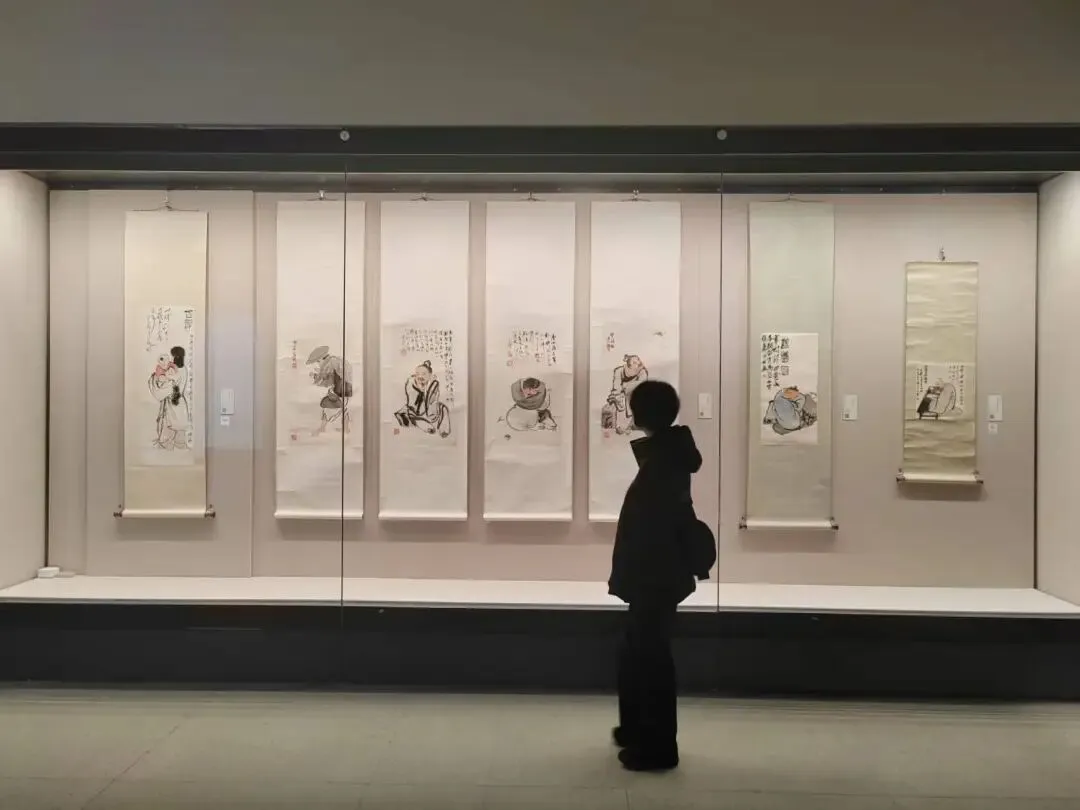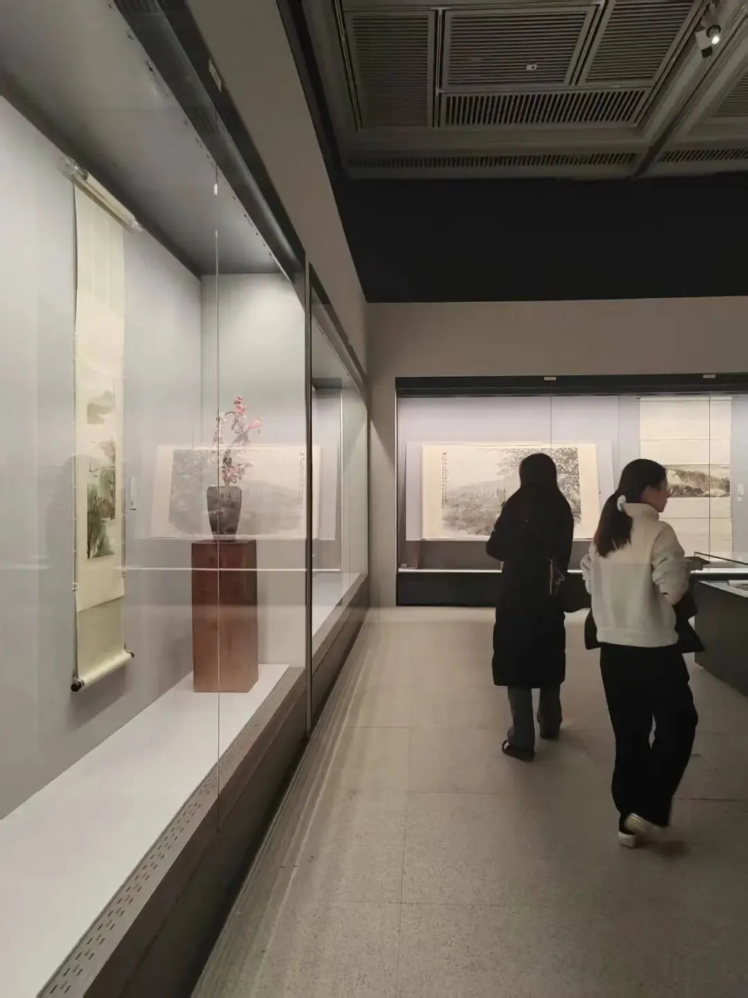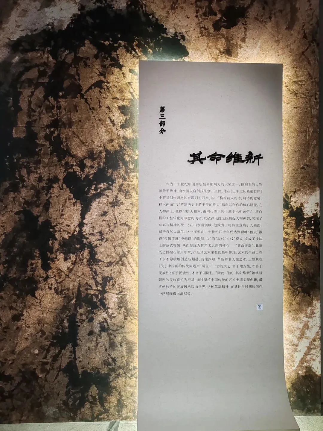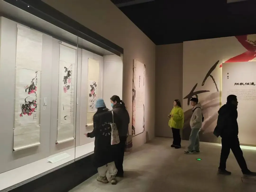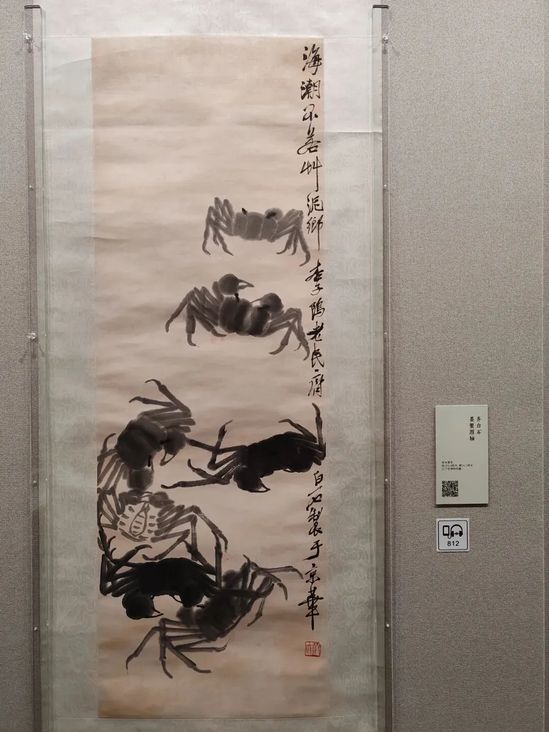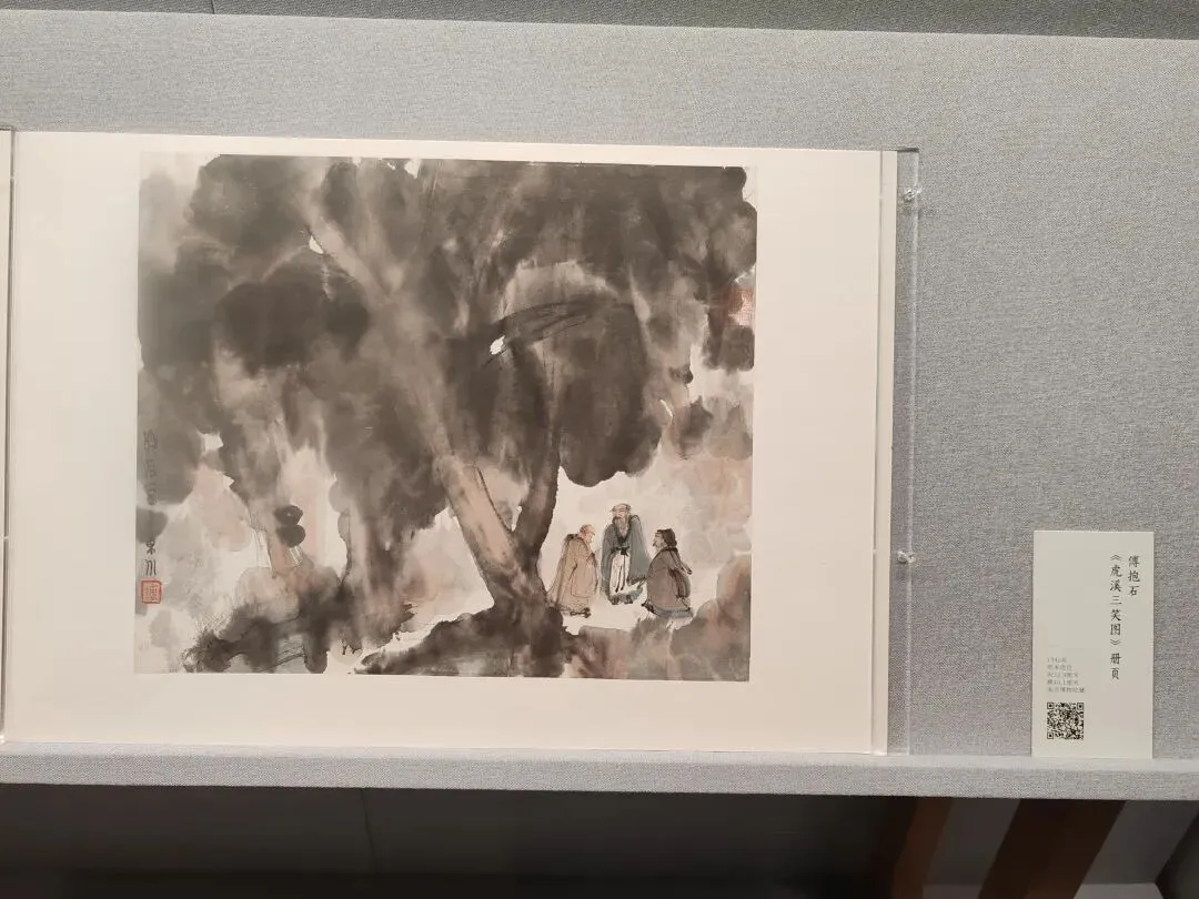 走在街上,微冷。商贩们,早早地就摆开摊位,艰难地招揽着生意。 在东风路与德雅路的十字路口,远远地,可以看到常绿行道树后,露出了湘博半遮半掩的侧脸。 小小的孩童,坐在手推车上,和我们一起等着红灯,准备过马路。 进了湘博,现在楼上往外看,是鲜活的当下,21世纪的长沙和中国。 在一楼的北侧,就可以看到《南北有“二石”》的巨型宣传立牌。 在展厅的门口,从左往右,就立着三块形状各一的立牌。 序厅是开放型的,没有买票的观众,也能够看到展览的序言:“二石”艺术年表。 把齐白石和傅抱石两位20世纪最伟大的两位中国画家放在一起比较展出,这应该是第一次。 把他们放在一起展出的逻辑,是他们都是20世纪中国画创新,贡献最卓著的几位大家之一。 在上个世纪,在中国画创新上面,能与他们并肩的,大概只有吴昌硕、张大千、徐悲鸿和黄永玉等寥寥数人。 讲的是白石老人“衰年变法”的历程和他的“红花墨叶”大写意花鸟画。 讲的是白石老人通过对前人的继承与扬弃,通过对自然与生活的观察,在构图与笔墨上多有变革,最后形成了他独特的富有生活气息与神韵的艺术表达。 在这一部分的结尾,有一个观众与AI进行互动的小环节。 这一部分,讲的是齐傅二人的篆刻艺术。展出的是他们的印章。 第三部分叫:《其命维新》。“其命维新”,是傅抱石的一枚印章。 所以,这一部分,是说的傅抱石的艺术创新活动与成就。 讲的是傅抱石独创“抱石皴”,从中国古人古诗、日本绘画和时代精神中创新山水画法的过程与成就。 这一部分是展示的傅抱石与齐白石在新中国成立后,与时俱进,进行创新的历程及成果。 最近几年,我也参观了二三十家博物馆。我发现湖南省博物馆有一个与众不同的特点,或者说优点。 就是,绝大多数的博物馆,不会凸显策展中的具体的工作人员,而只是让笼统的某某博物馆某某中心这个集体的名义出现在公众的面前。 但是湖南博物馆会把策展中的每一个工作人员的名字,展示在公众面前。个人的贡献与荣耀,领导和集体不会剥夺。 这是一个非常好的传统,折射出“眼睛中有人”的人文主义精神。 如果,能像其他博物馆一样,摆放一些蒲团或者坐垫就好了。 展厅的出口旁,有一个小小的文创商店,店子和商品,都很精致。 展厅中的插花,都还有点意思。都能与相关单元的意旨贴合。 观众们走在展厅里,也融入了展陈之中,变成了画中的人物。 我挑选了一些我喜欢且认为重要的展品,拍摄下来,列举如下: 艺术品,尤其是书法与绘画,是需要到现场揣摩原作的。