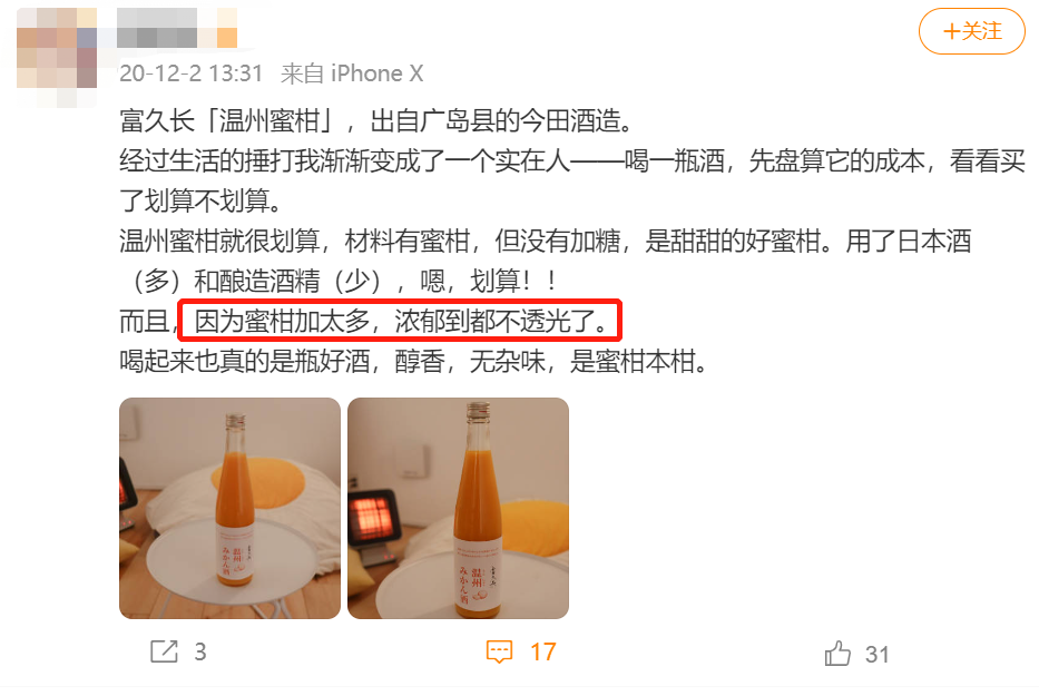 二是它浓厚但不齁甜,因为没有额外添加白砂糖,也没加香精——就是新鲜橘子汁那种天然的糖酸平衡。(作为配料表警察,富久长的各种果酒真是我见过最干净的了)