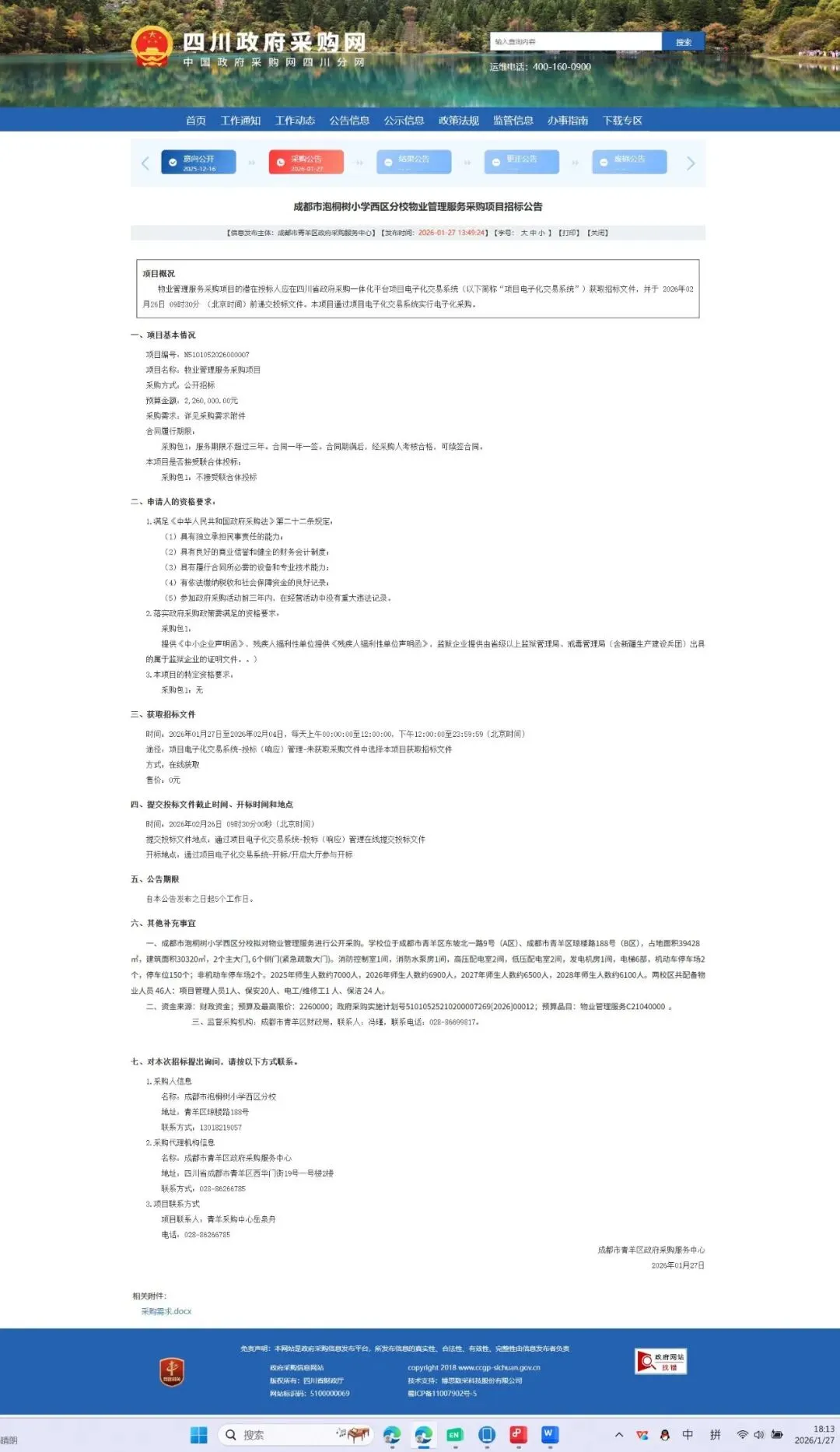 采购包1:服务期限不超过三年。合同一年一签。合同期满后,经采购人考核合格,可续签合同。1.满足《中华人民共和国政府采购法》第二十二条规定:(5)参加政府采购活动前三年内,在经营活动中没有重大违法记录。提供《中小企业声明函》,残疾人福利性单位提供《残疾人福利性单位声明函》,监狱企业提供由省级以上监狱管理局、戒毒管理局(含新疆生产建设兵团)出具的属于监狱企业的证明文件。。)时间:2026年01月27日至2026年02月04日,每天上午00:00:00至12:00:00,下午12:00:00至23:59:59(北京时间)途径:项目电子化交易系统-投标(响应)管理-未获取采购文件中选择本项目获取招标文件时间:2026年02月26日 09时30分00秒(北京时间)提交投标文件地点:通过项目电子化交易系统-投标(响应)管理在线提交投标文件开标地点:通过项目电子化交易系统-开标/开启大厅参与开标一、成都市泡桐树小学西区分校拟对物业管理服务进行公开采购。学校位于成都市青羊区东坡北一路9号(A区)、成都市青羊区琼楼路188号(B区),占地面积39428㎡,建筑面积30320㎡,2个主大门, 6个侧门(紧急疏散大门)。消防控制室1间,消防水泵房1间,高压配电室2间,低压配电室2间,发电机房1间,电梯6部,机动车停车场2个,停车位150个;非机动车停车场2个。2025年师生人数约7000人,2026年师生人数约6900人,2027年师生人数约6500人,2028年师生人数约6100人。两校区共配备物业人员 46人:项目管理人员1人、保安20人、电工/维修工1 人、保洁 24 人。二、资金来源:财政资金;预算及最高限价:2260000;政府采购实施计划号51010525210200007269[2026]00012;预算品目:物业管理服务C21040000 。 三、监督采购机构:成都市青羊区财政局,联系人:冯瑾,联系电话:028-86699817。https://www.ccgp-sichuan.gov.cn/maincms-web/article?type=notice&id=28920f8f-6c94-4503-a052-dacb08cb73ae&planId=8a69d67e9b9eefe3019ba17a1f762277