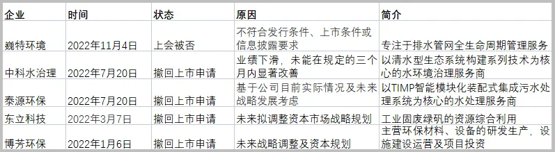 泰源环保、东立科技和博芳环保三家企业公告,因为企业战略发展等原因而自行终止上市申请,撤回申请材料。其中东立科技已完成三轮问询回复,有新项目预计在今年下半年建成投产;博芳环保则在撤回上市申请后,11月9日拟向广发银行广州分行和兴业银行广州分行2家银行合计申请2000万授信。