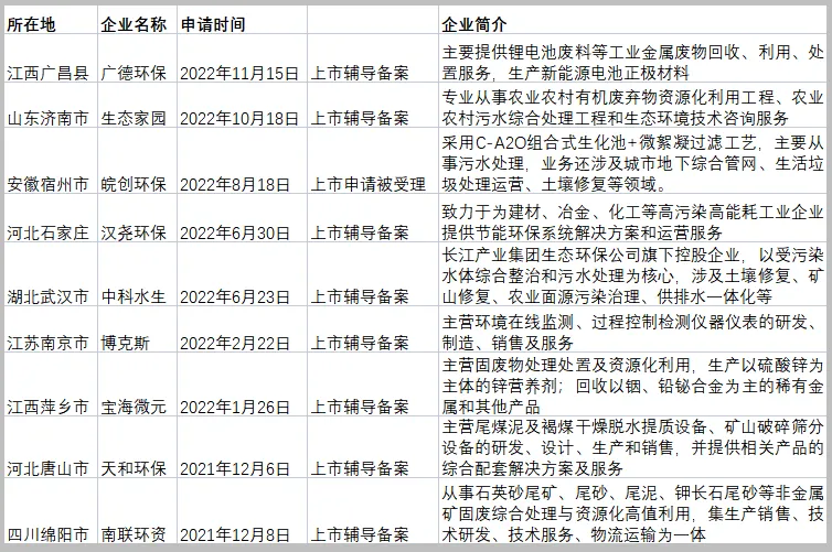 在3家上市和5家终止外,这一年内,还有9家环保企业计划进行北交所上市。具体如下: