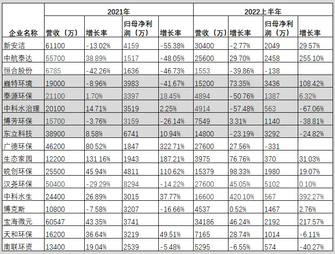 在归母净利润方面,2022年上半年,17家企业中有12家企业实现正增长,另外5家企业的增长率为负,其中包括3家终止上市的公司,仅有恒合股份和广德环保显示亏损。