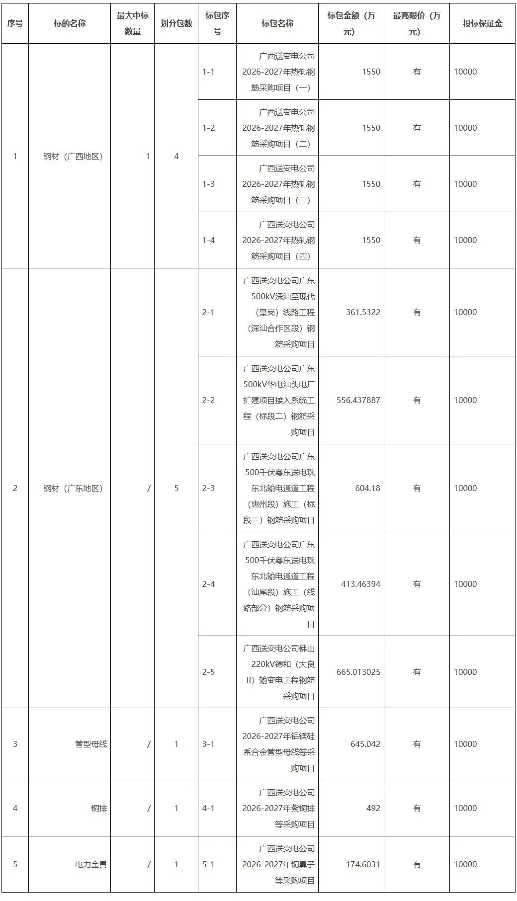 2.1项目概述:本项目为送变电公司2026年热轧钢筋等一批工程物资材料采购,划分为5个标的12个标包。县体详见附件A-项目信息清单。