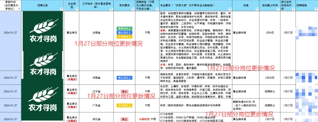 农林牧渔食品生物学相关招聘岗位更新表2026年1月27日更新53条,继续更新中,自7月更新以来已收集4434条,注意:岗位表中部分26届补岗位1月30日前截止请尽快投递。