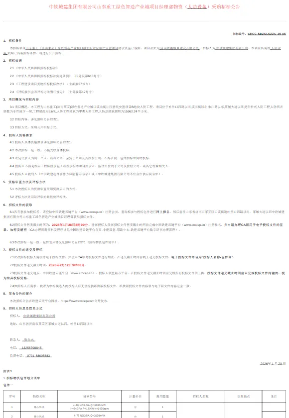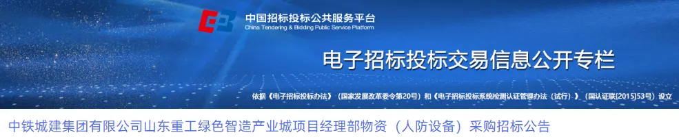 招标公告:中铁城建集团有限公司山东重工绿色智造产业城项目经理部物资(人防设备)采购