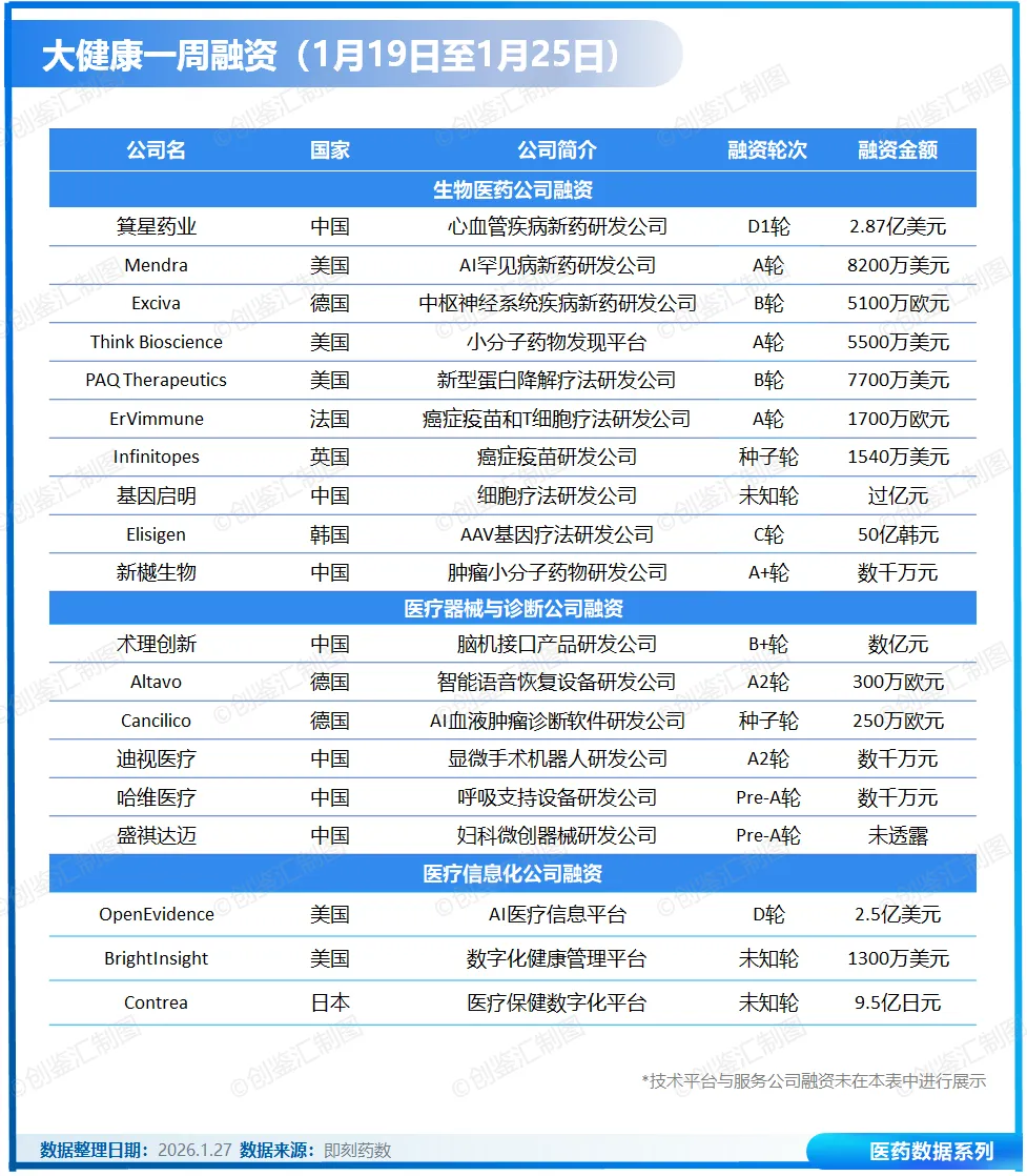 据创鉴汇不完全统计,上周(1月19日至1月25日),全球大健康领域共披露融资事件22起,总金额近9.2亿美元。