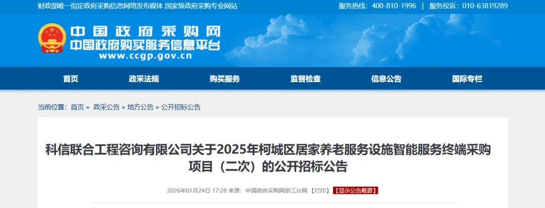 1 | 2025年柯城区居家养老服务设施智能服务终端采购 | 1项 | 44.67万元 | 主要包含整合智慧助餐、健康支持、无感监测等多元场景,以满足居家养老和社区养老的老年人多样化的生活需求,具体详见采购文件“第三章服务内容及要求” |
