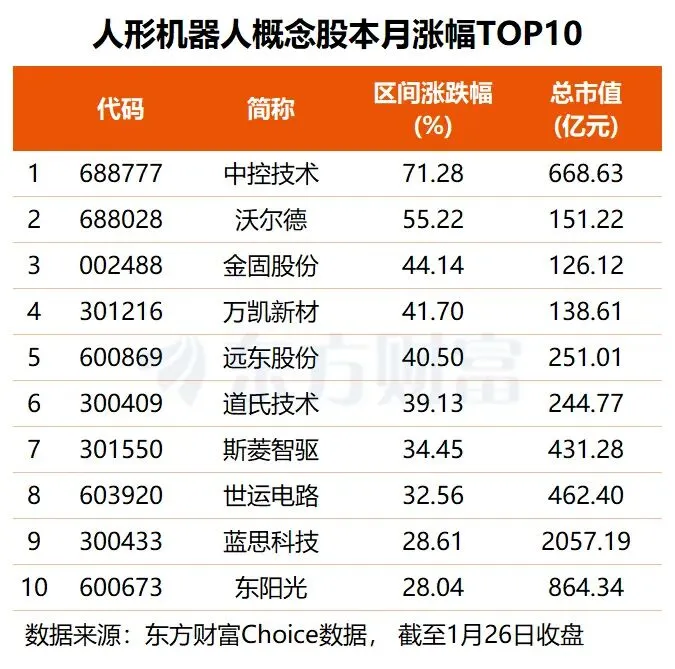 据1月机构调研数据,本月获调研的高研发强度人形机器人概念股中,以下5只标的最受关注: