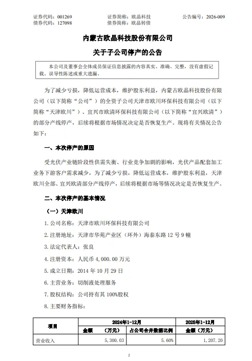 1月23日,欧晶科技(002169)公告称,为了减少亏损,降低运营成本,维护股东利益,公司的全资子公司天津市欧川环保科技有限公司(以下简称“天津欧川”)、宜兴市欧清环保科技有限公司(简称“宜兴欧清”)的部分产线停产。