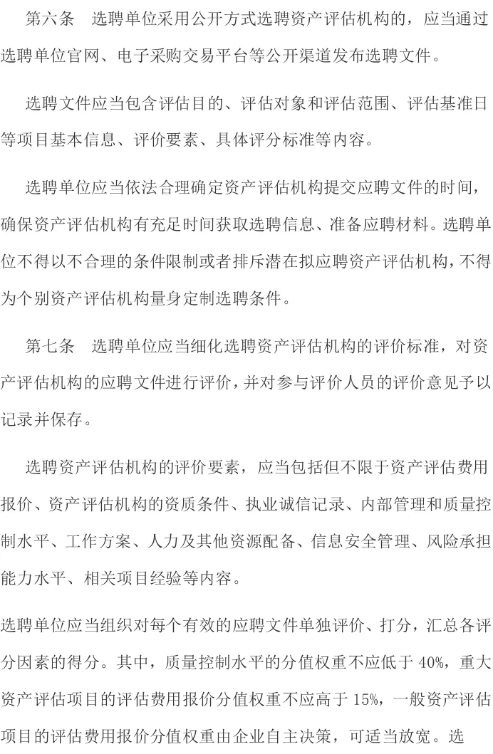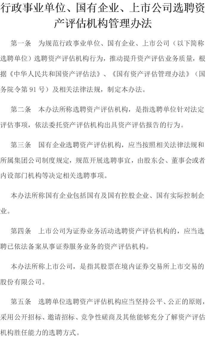 第五条:选聘应当坚持公平、公正的原则。注意:这里并没有将“公开”作为选聘原则。只要是“能够充分了解资产评估机构胜任能力”的方式,比如比选、询价、直接谈判等都可以。那么,哪些要公开选,哪些可以不公开选?上面第三条就说了,集团公司要制定相应的选聘制度,对于法律法规不做强制要求的内容,自己进行规范。做到有制度可依即可。