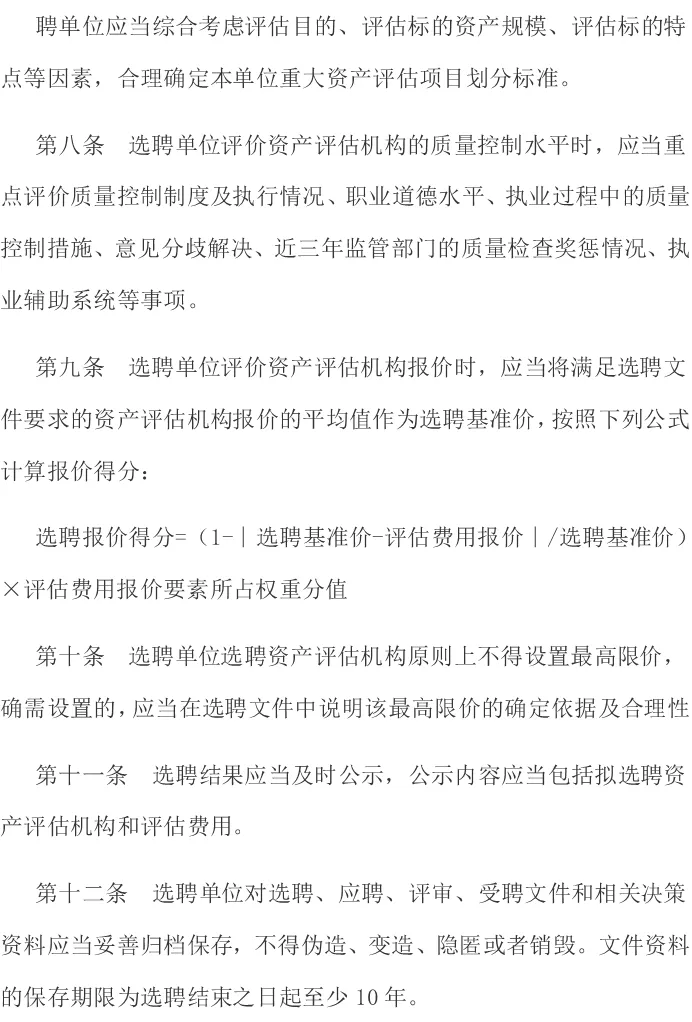 第七条到第十三条讲得就是这个事情。对评价要素、价格、保密等进行规范。如同会计师事务所选聘办法,137号文同样关注行业底价竞争问题,要求“选聘单位评价资产评估机构报价时,应当将满足选聘文件要求的资产评估机构报价的平均值作为选聘基准价”“重大资产评估项目的评估费用报价分值权重不应高于15%”。
