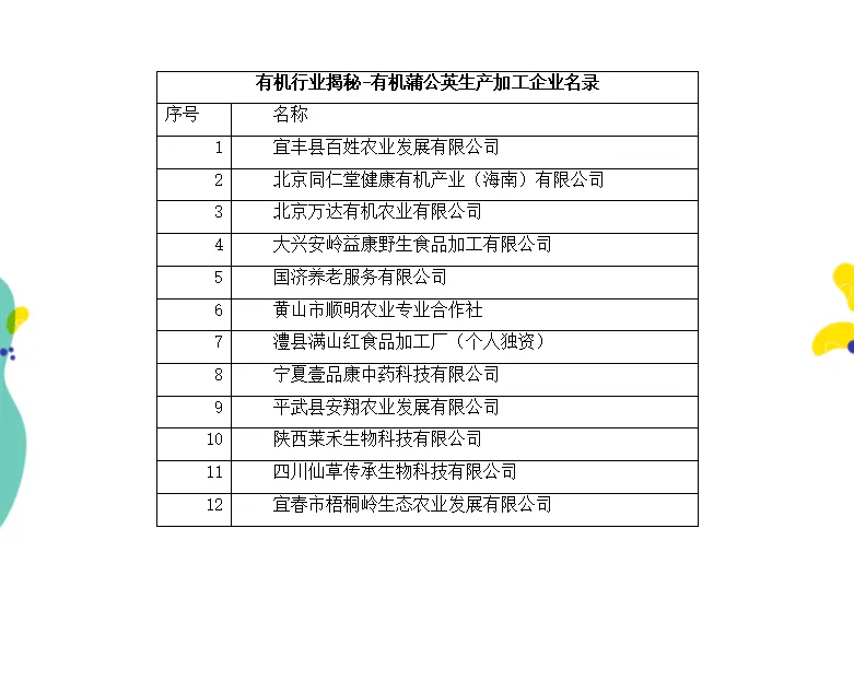 蒲公英作为食药同源物质,产业链已从传统的中药饮片,延伸至食品饮料(固体饮料、粉剂、配料等等)、保健产品等多个领域。目前,经过中国有机认证的蒲公英生产加工企业共有12家,具体如下: