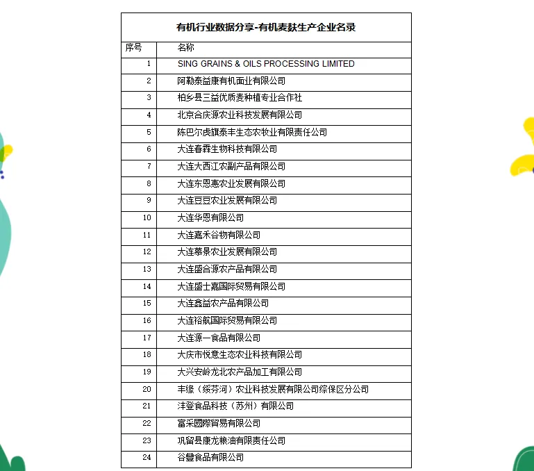 主要指通过有机小麦加工获得的麸质(麦麸),但产业链价值更在于其精深加工产品,如膳食纤维粉、蛋白肽、阿拉伯木聚糖等高附加值成分,麦麸90%用作饲料,而通过超微粉碎、改性、蛋白修饰、活性物质提取等技术,可将其转化为高端食品、保健品原料,应用于食品和饮料、个人护理、药品和保健品、动物饲料等领域。目前,经过中国有机认证的麦麸生产加工企业共有70家,具体如下: