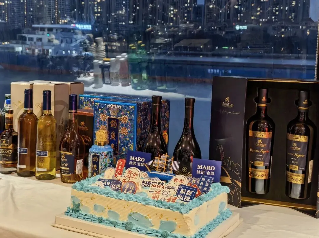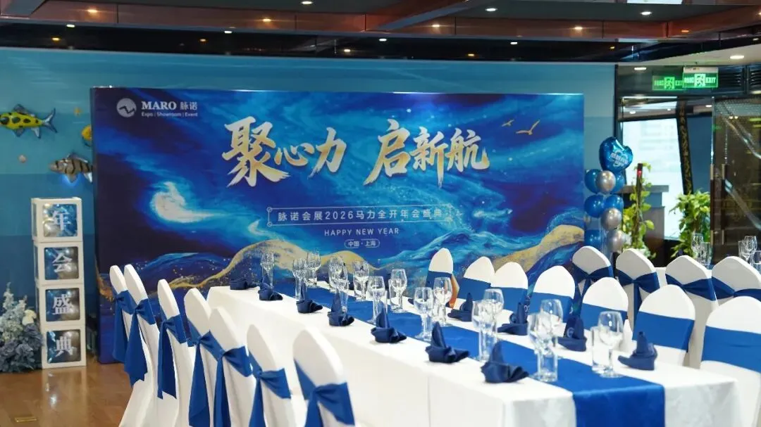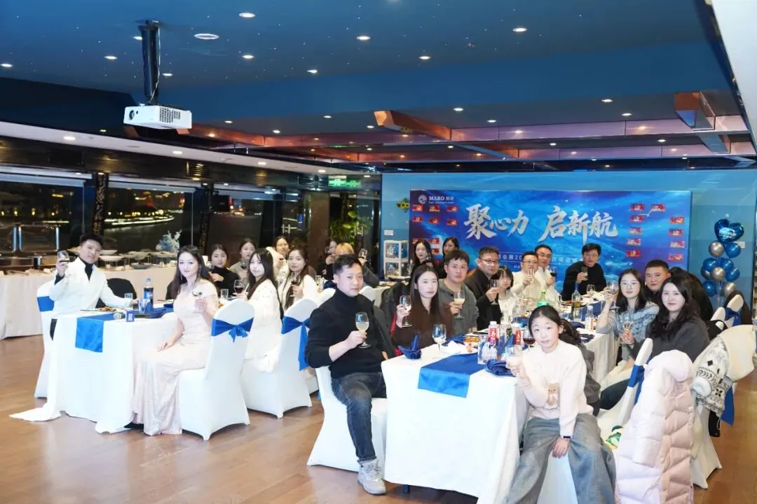 晚宴上,每一道美食都承载着心意。精致的甜点上,插着印有 “MARO EXPO 脉诺会展” 的深蓝色旗帜;特制的蛋糕上,“梦想启航”“奔赴前程”的祝福语熠熠生辉。觥筹交错间,分享的不仅是美味,更是一年来并肩奋斗的情谊,与对未来征程的满满信心。