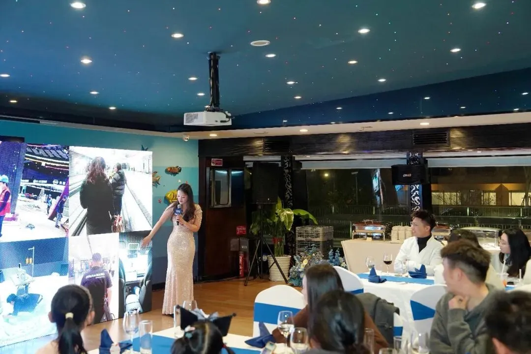 华灯初上,浦江两岸建筑群如钻石般闪烁。窗外,是上海最动人的夜景画卷——东方明珠、上海中心大厦等城市地标熠熠生辉,勾勒出世界级天际线。游轮行于江心,宛如在星河中航行,寓意着脉诺会展在浩瀚商海中稳健前行、视野开阔。当“聚心力,启新航”的蓝色主题背景板在船舱内亮起,一场属于脉诺人的夜晚正式拉开帷幕。