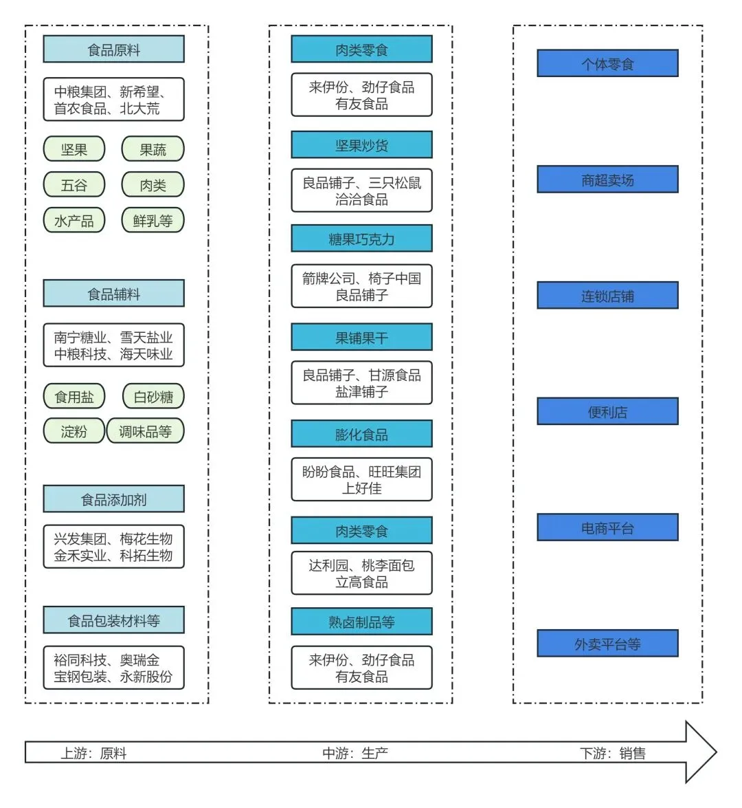 休闲食品指通常在闲暇时间或正餐之间作为快速、方便地选择的零食及糕点。休闲食品产业链呈现“上游供给-中游加工-下游分销”的完整架构:
