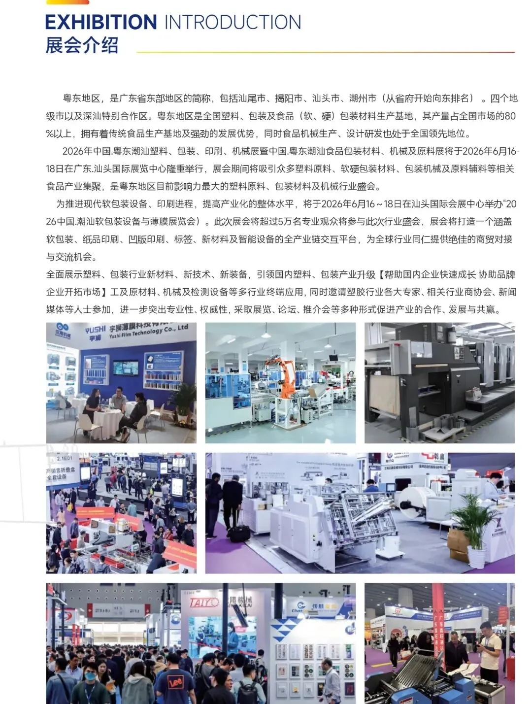 “潮汕塑博会暨工业博览会”,将继承和发扬往届展会高规格、上规模、专业化的特色,提高服务质量,扩大宣传力度,集结一大批国内特别是闽粤赣等知名企业参展,同时将更广泛地组织国内专业观众参观采购。将集中展示“机械设备,包装印刷,配件耗材,智能自动化”等领域产品,全面覆盖橡塑制品、食品饮料包装、汽车配件、日化用品、医疗用品、化工及原材料、机械及检测设备等多行业终端应用,同时邀请塑胶行业各大专家、相关行业商协会、新闻媒体等人士参加,进一步突出专业性、权威性,采取展览、论坛、推介会等多种形式促进产业的合作、发展与共赢。