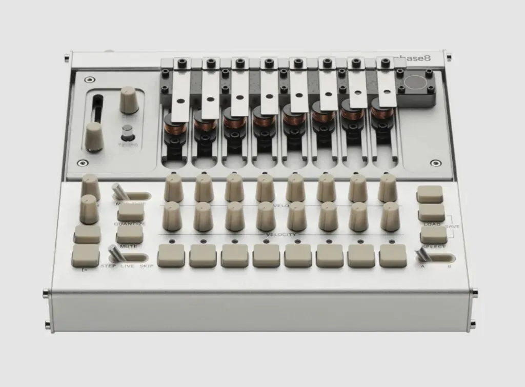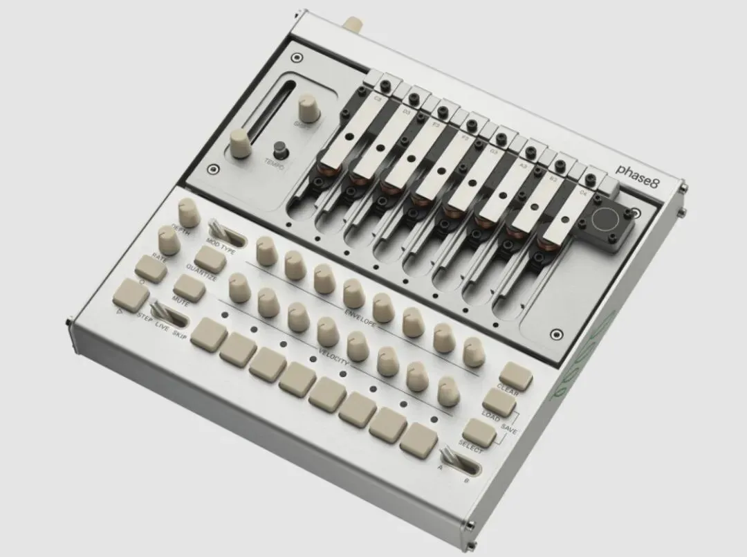 phase8的核心是八个独立的机电音源,驱动可互换的钢制谐振器,产生真实的声学振动。随附十三个半音阶调谐的谐振器,可同时安装八个,用户可自行配置音高、音阶和音色特征。包络控制可实现从短促打击音到持续音调的声音变化,谐振器还可更换或重新调音,以适应不同音乐风格。