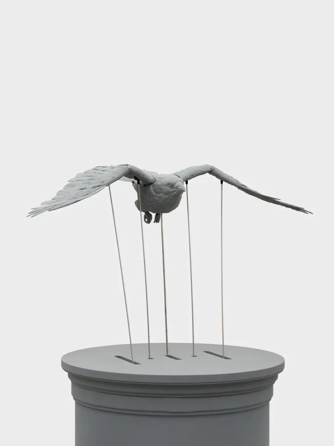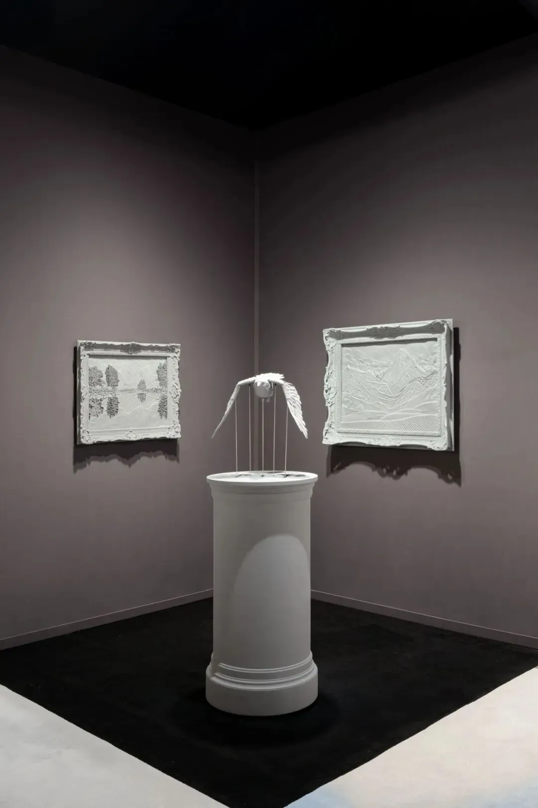 展位的中心位置呈现的是比利时艺术家汉斯·欧普·德·贝克(Hans Op de Beeck)全新创作的动态雕塑《乌鸦》。作品以等身尺寸的乌鸦悬置于空间之中,双翼以缓慢而有节奏的方式拍动,营造出仿若即将飞翔的幻觉。《乌鸦》在机械的精确性与内敛的忧郁气质之间取得平衡,展现了欧普·德·贝克对静止、孤独与时间流逝的诗性探索。