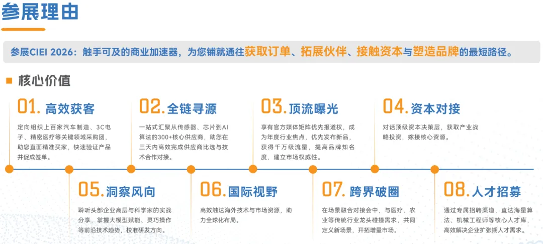 在CIEI2026,全球产业链资源将被高效链接,从关键技术、核心部件、系统集成到多元场景应用,形成闭环。我们全力推动人机协同从概念走向广泛落地,加速产业生态的系统性升级,共同缔造一场定义智能装备未来图景的shijieji思想与产业盛宴。