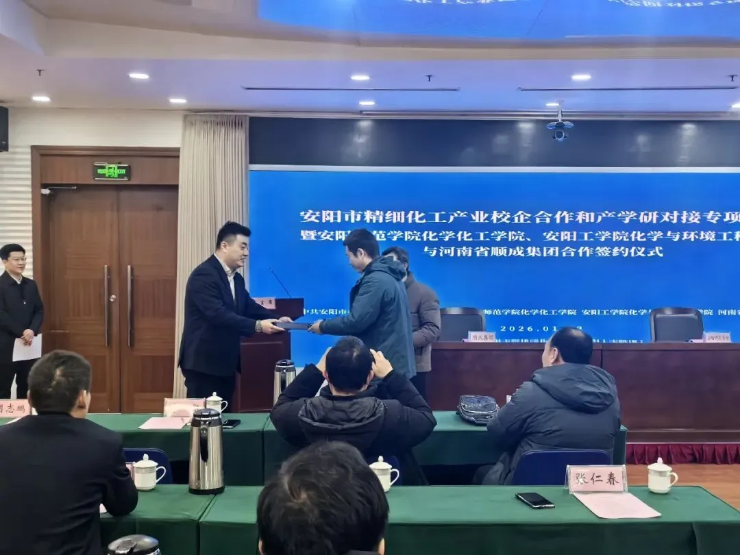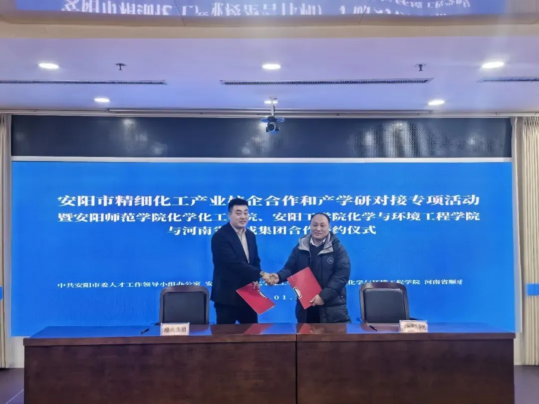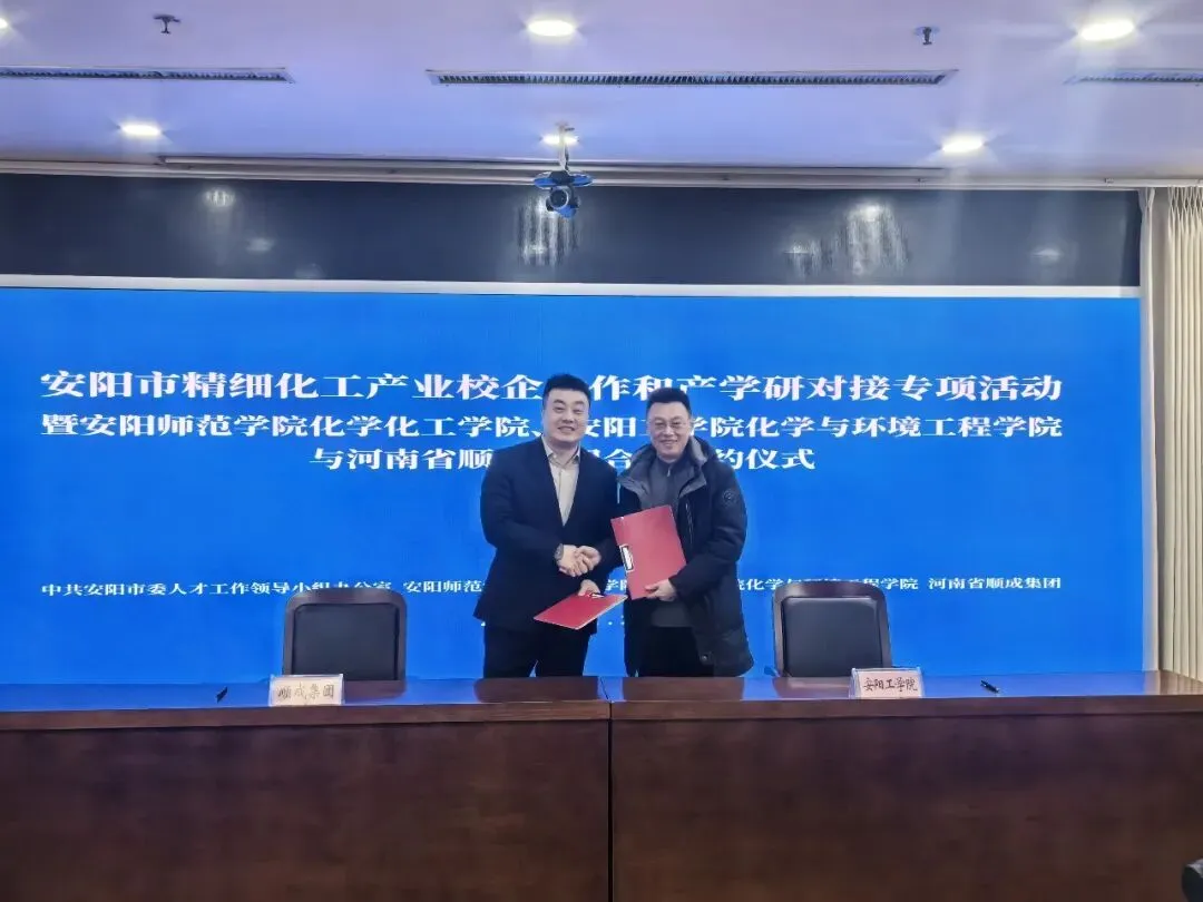 现场,顺成集团分别与安阳师范学院化学化工学院和安阳工学院化学与环境工程学院围绕科研攻关、技术突破、创新平台共建、人才培养、产学研用合作等进行签约。“化工学院与顺成集团的合作是深化产教融合、促进技术转移的关键一步。我们将竭尽全力,做好对接与服务,确保合作项目高效落地,切实将学校的科研力量转化为助推企业创新与区域发展的强劲动力。”安阳师范学院科研处副处长鞠林说。