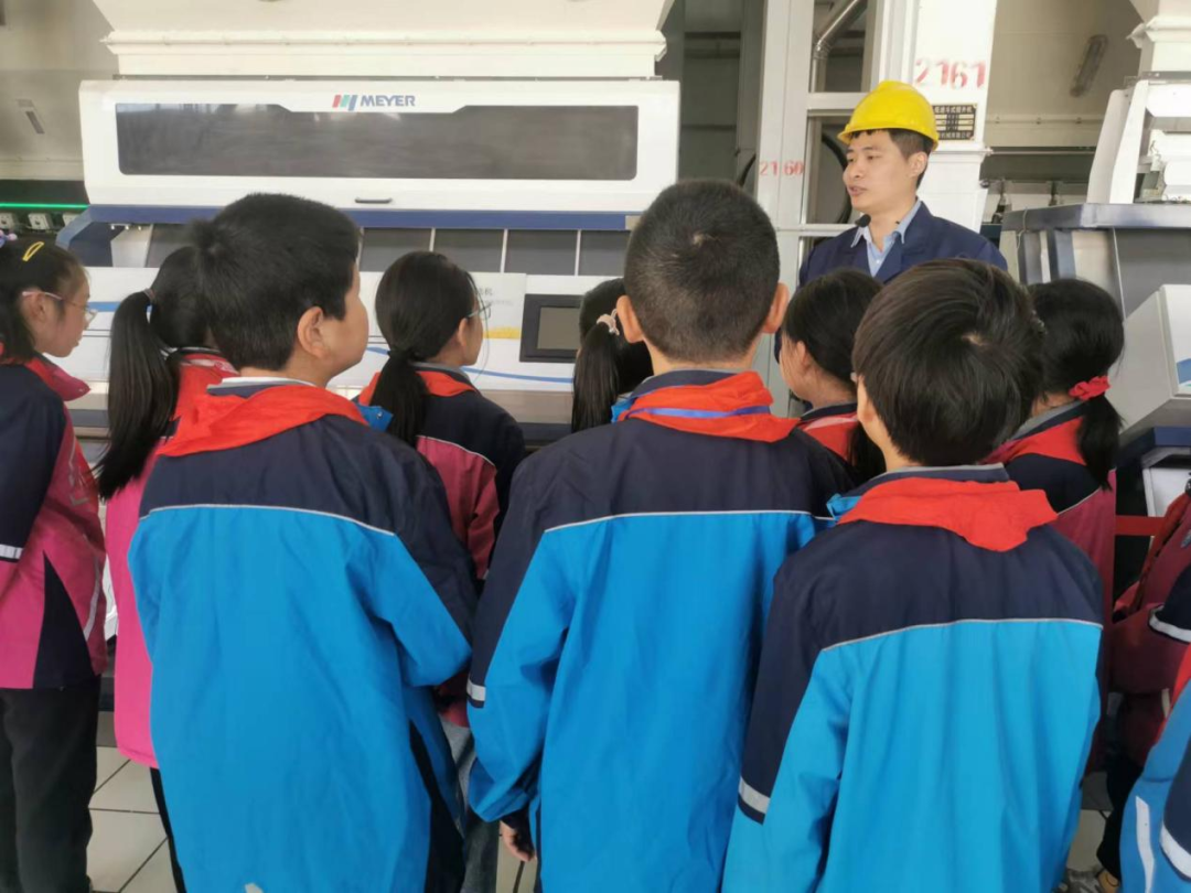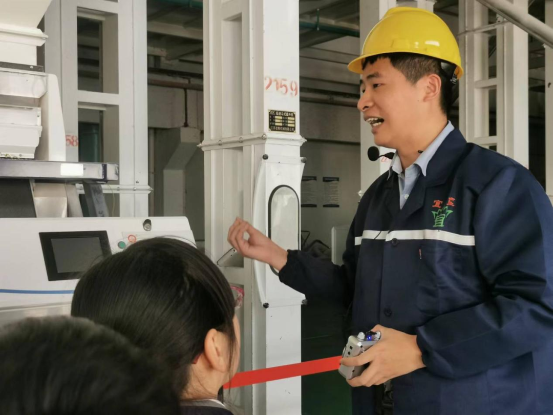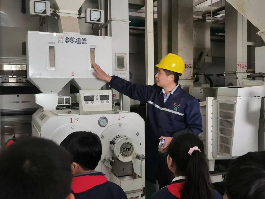 队员们排好队走进生产车间,目光随即被各种比自己大了好几倍的机器所吸引。在百粮农业总经理路阳叔叔的讲解下,队员们依次参观了充氮低温粮仓、大米加工车间、包装车间等,了解低温充氮技术保存粮食原理和方法;现场观摩加工车间去石机、砻谷机、碾米机、白米分级筛、色选机、抛光机等设备作业场景,加深对稻米加工全产业链条认知。