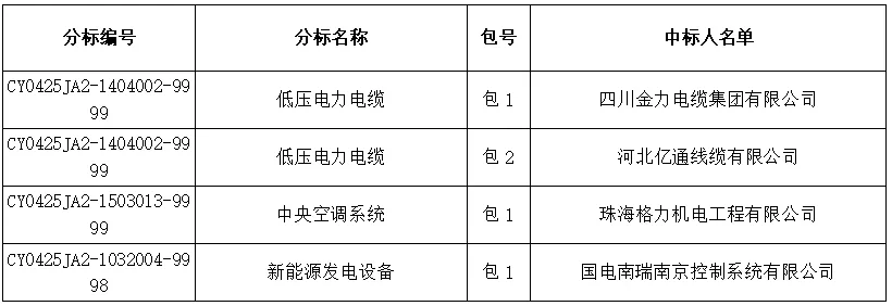 国网河北省电力有限公司子公司(含原集体企业)2025年第二次物资类公开招标采购项目的中标候选人公示活动已经结束,现将中标人名单公告如下: