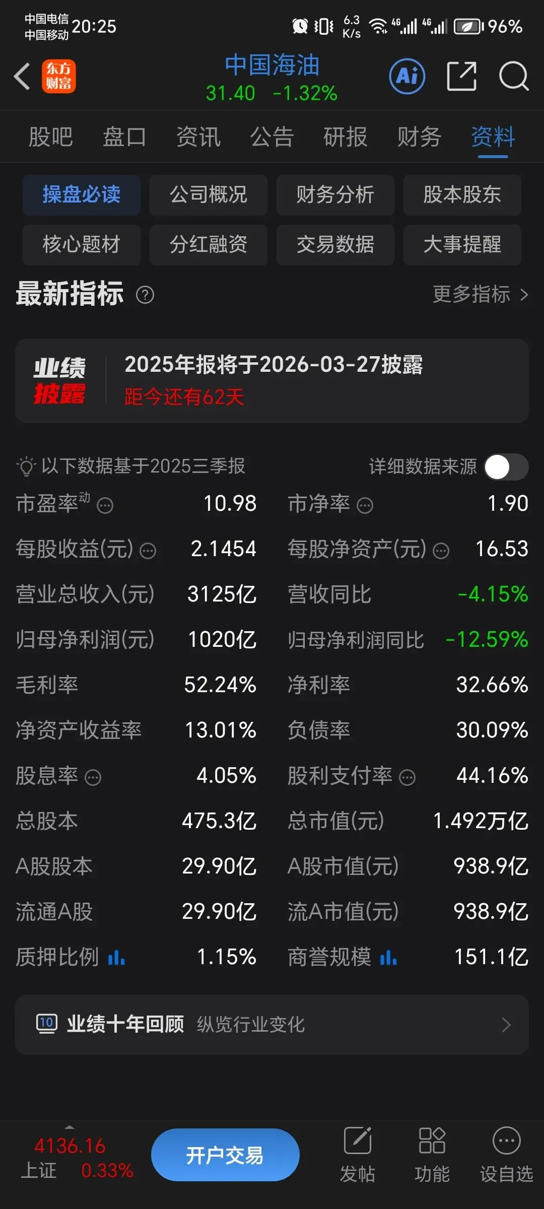 营业总收入:3125.03 亿元,同比下降 4.15% 归母净利润:1019.71 亿元,同比下降 12.59%(降幅小于油价跌幅) 扣非归母净利润:1009.15 亿元,同比下降 12.91% 经营现金流净额:1717.49 亿元,为利润的 1.69 倍,现金流充沛 油气净产量:578.3 百万桶油当量,同比增长 6.7%