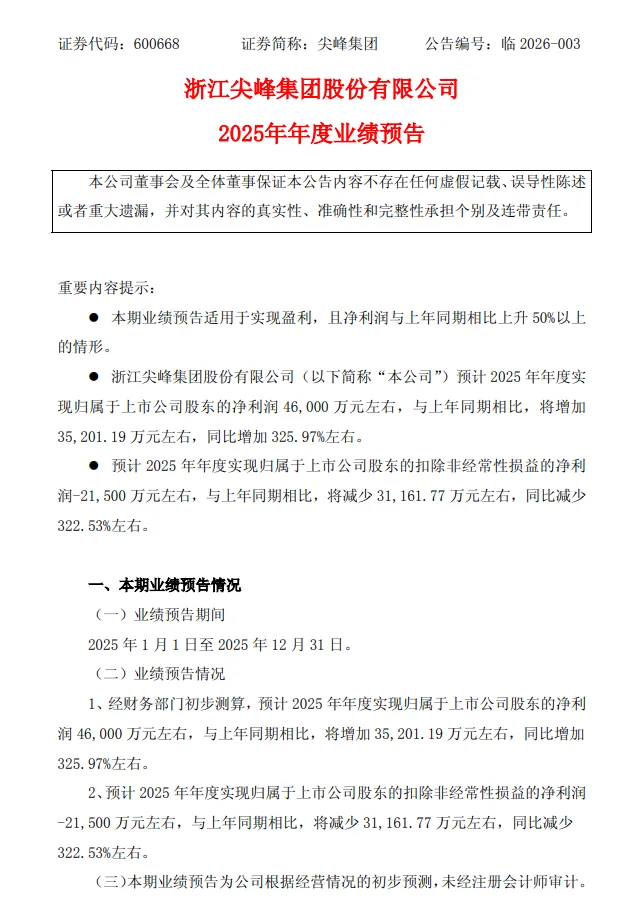 与亚洲水泥的经营性盈利不同,尖峰集团1月27日披露的业绩预告则呈现“账面高增、主业承压”的特征。公告显示,公司2025年预计归属于上市公司股东的净利润约4.6亿元,同比激增325.97%,但扣除非经常性损益后的净利润却亏损2.15亿元,同比大幅减少322.53%。这种反差源于联营企业带来的大额非经常性收益。