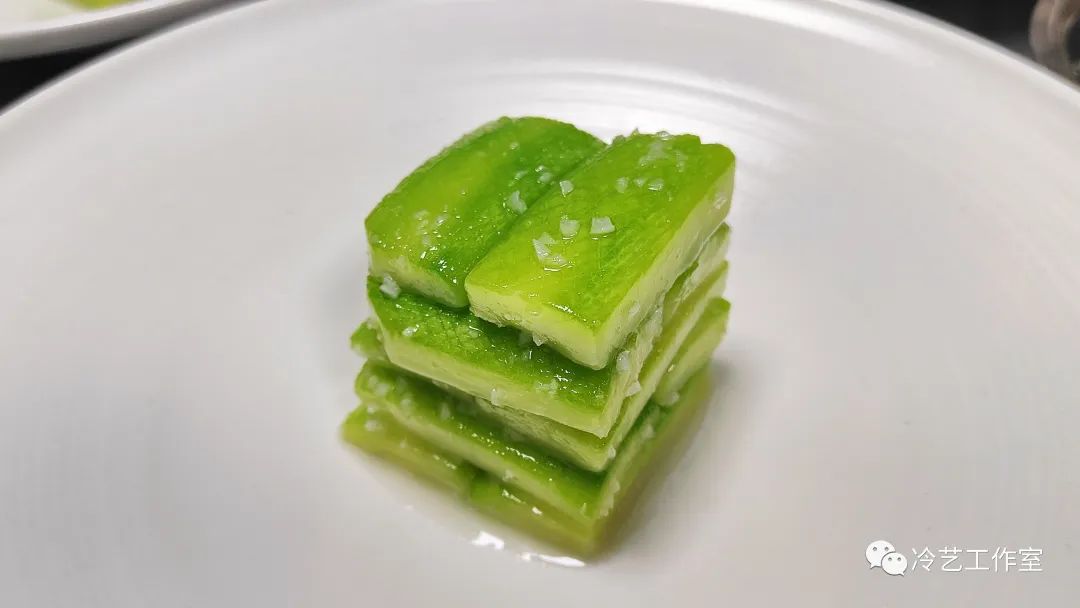 1.选用皮较嫩的佛手瓜,一开四去核,切出小方块。