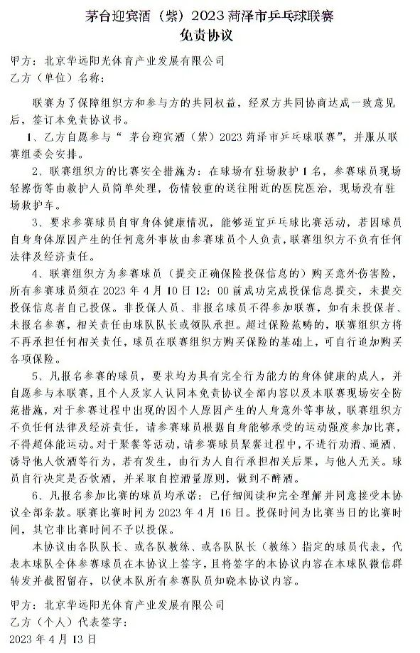 9、 下文”茅台迎宾 酒(紫)2023菏泽市乒乓球联赛”免责协议,进行公众号公示,并由队长或赛事承办方转发队员群或转发给球员,球员同意报名的,视同球员签字,本协议有效。 未投保的球员需在开赛前一天进行投保,未有保险证明者不能参赛,若违规参赛,相关责任归属见本电子秩序册“免责协议”。十二、参赛队员