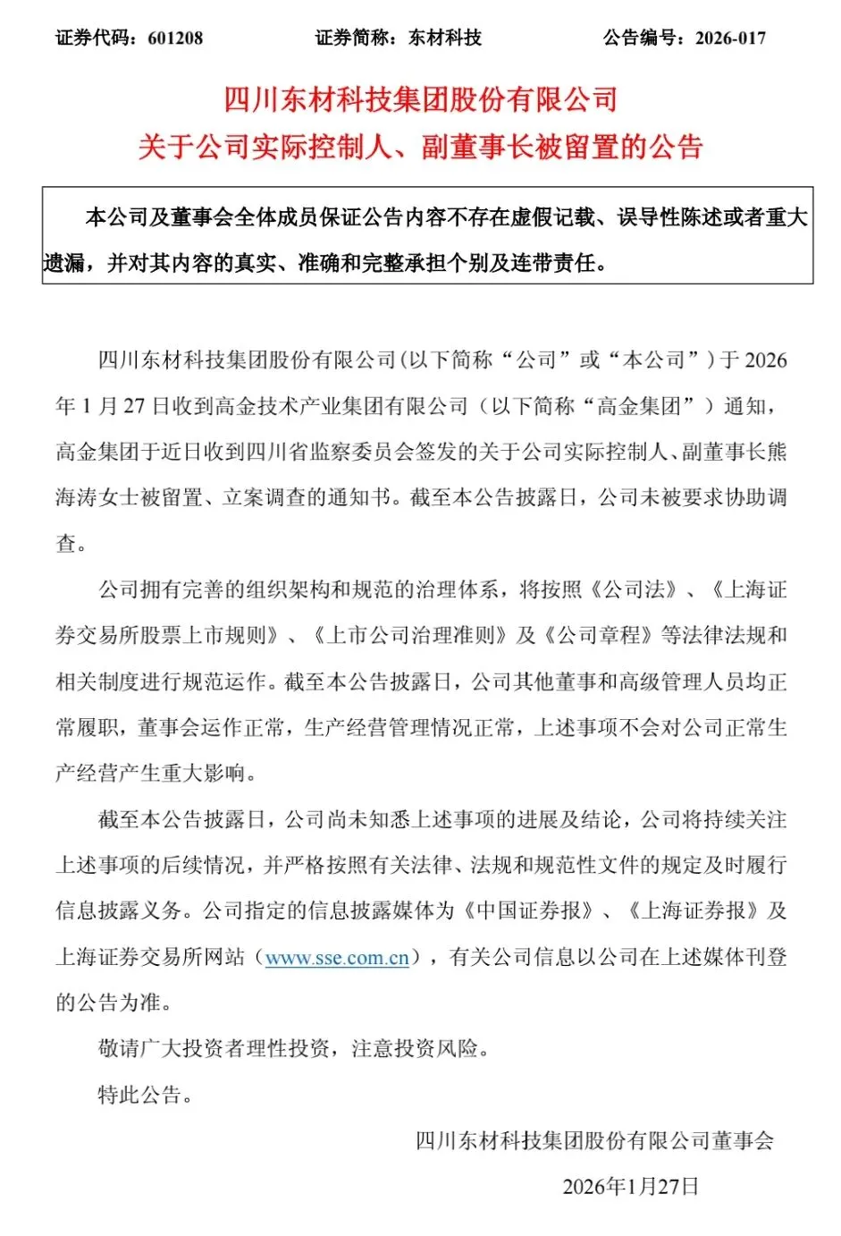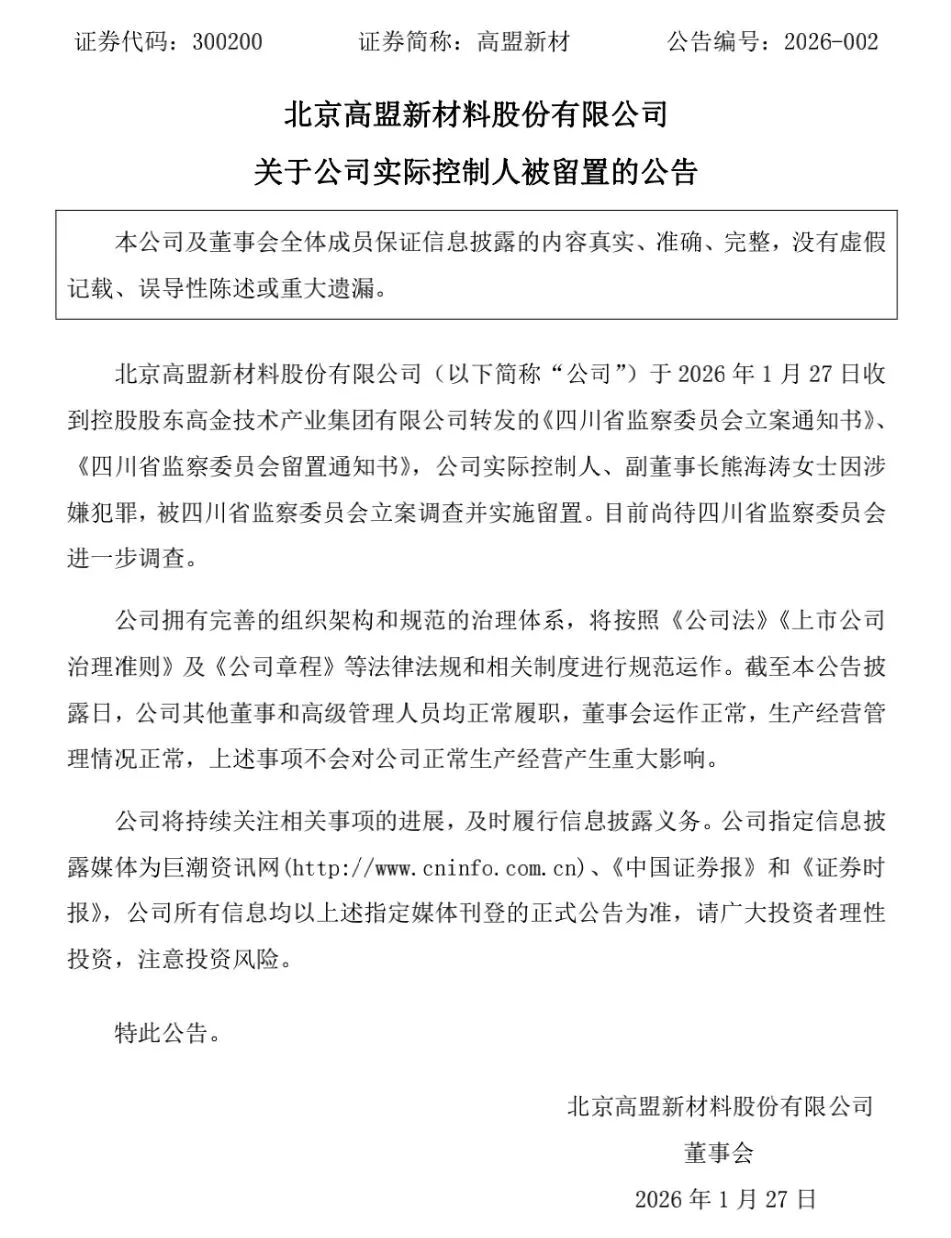 2026年1月27日,A股市场突发重磅公告:东材科技(601208)、毅昌科技(002420)、高盟新材(300200)三家上市公司同步披露,公司实际控制人、副董事长熊海涛女士因涉嫌犯罪,被四川省监察委员会立案调查并实施留置。这则公告犹如一颗巨石投入资本市场,不仅让三家总市值超370亿元的上市公司陷入舆论焦点,更牵扯出一段尘封20年的国企改制争议往事。