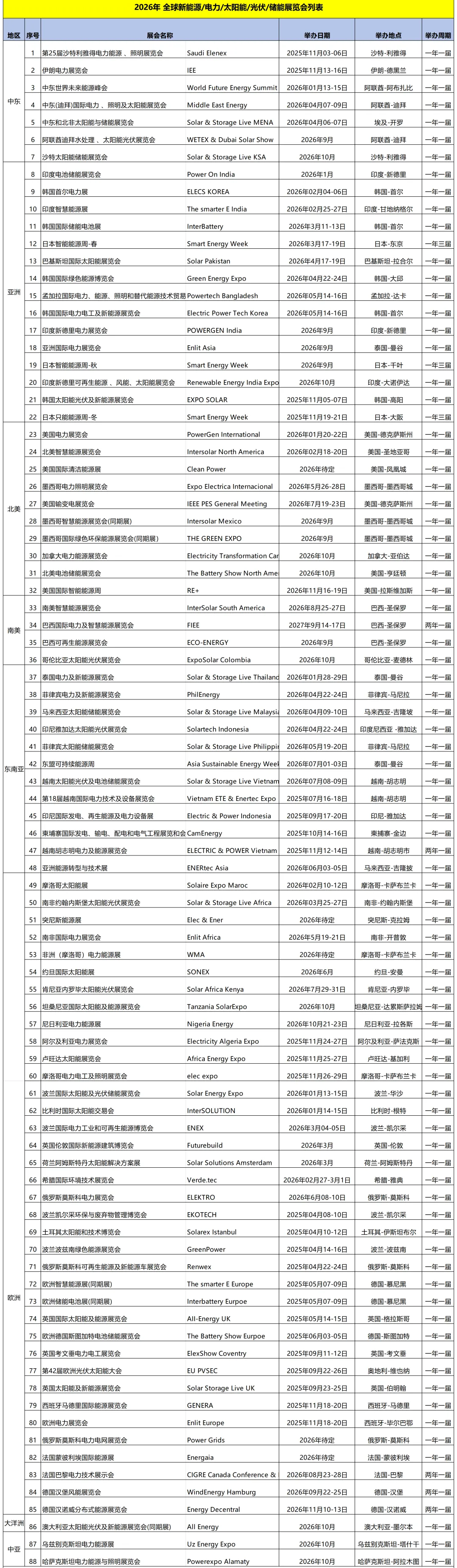 2026年 全球新能源/电力/太阳能/光伏/储能展览会列表