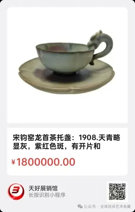 宋钧窑龙首茶托盏:高6厘米,底托直径13.5厘米,杯口径8厘米。天青略显灰,紫红色斑,有开片和气泡。来源1908.V.