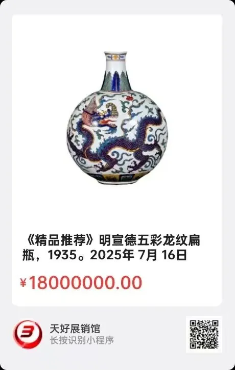 明宣德五彩龙纹扁瓶,高43厘米,最大腹径33厘米。2025年 7月 16日,经天好评审团评审,以6票优势荣登精品榜,获第179期天好海选精品。来源1935.V.