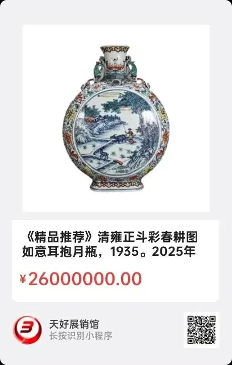 清雍正斗彩春耕图如意耳抱月瓶,尺寸:高59厘米,宽44厘米。2025年 8月 6日,经天好评审团评审,以6票优势荣登精品榜,获第182期天好海选精品。来源1935.V。