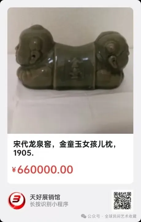 宋代龙泉窖,金童玉女孩儿枕,长24cm头高11cm枕心高7cm底宽9cm。来源1905.V.