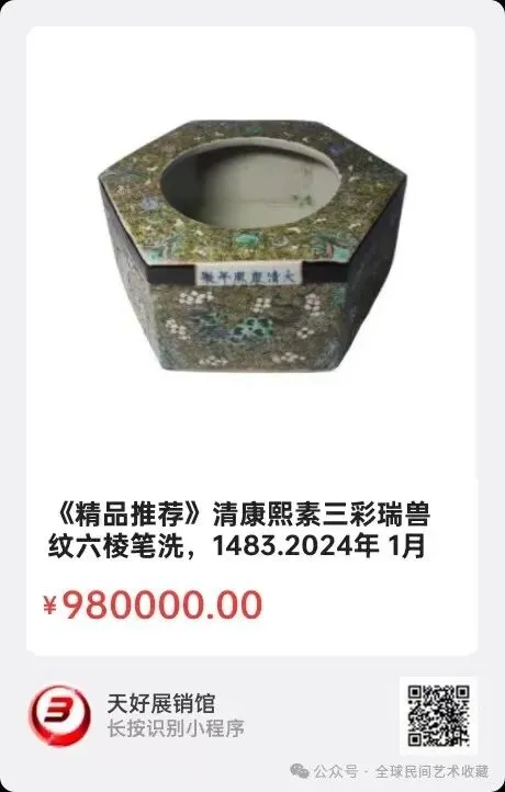 清康熙素三彩瑞兽纹六棱笔洗,高:9.5公分,宽:19.5公分。阐述:此笔冼胎土厚重,造型外六方,内圆,胎土精练,古仆美观大方,文人气息浓厚,且外上方边:大清康熙年制:款书端庄秀丽,先高温再低温,反复入窑。天然矿物质,描绘龙纹三方,活泼可爱的海马绘三方,花卉缠绵,精工细琢,工艺复杂,不计工本,它标志着康熙盛世瓷艺创作的灿烂辉煌,这是一件比较少见的文房四宝,是一件上了档次的塑三彩大号笔冼,文人墨客喜爱之物,具有一定收藏价值。赞:苍龙文房入笔冼,福在眼前海马昂,盛世千古康熙帝,瓷艺之史创辉煌。七旬瓷痴随笔於2024年元月。此笔冼己请曹晓宇专家老师鉴定。来源1483.V.