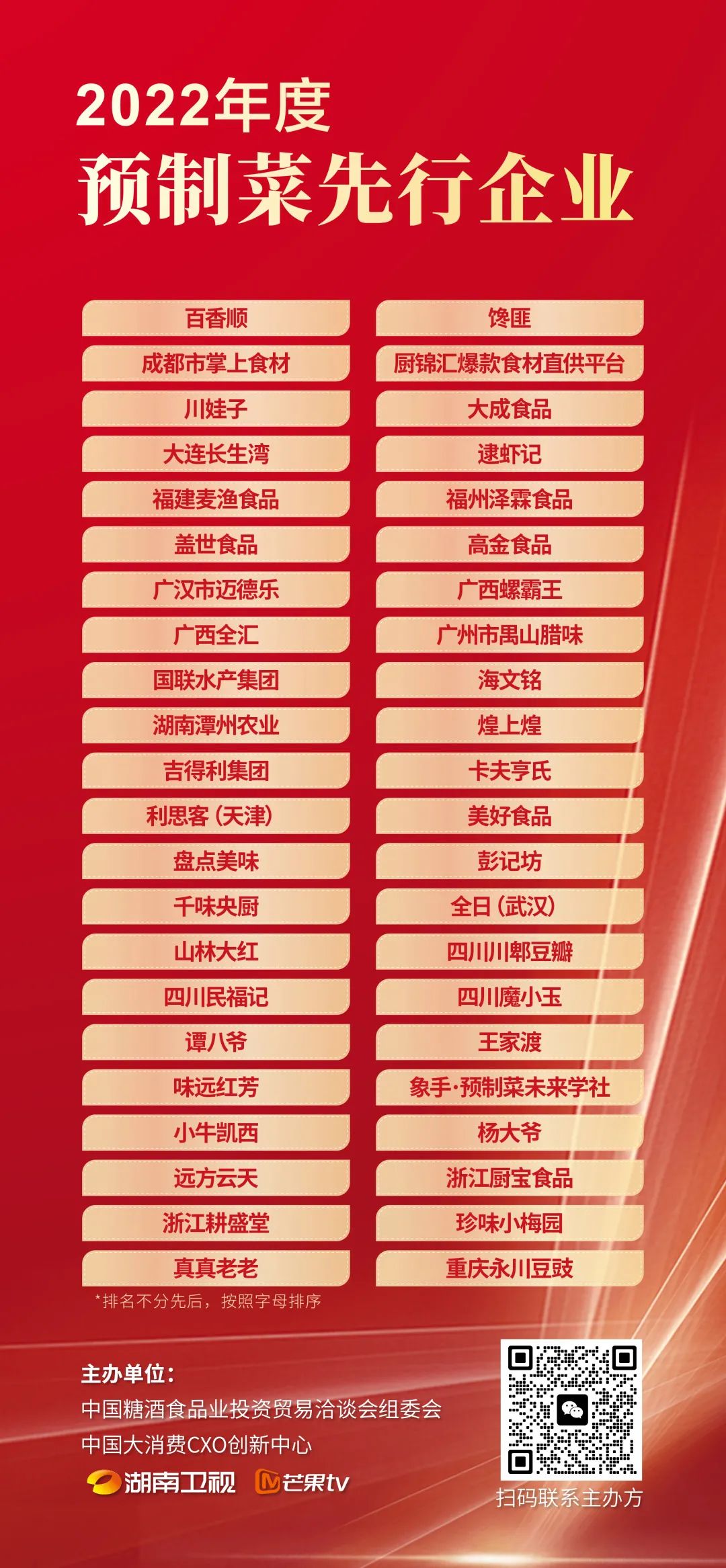 获得“2022年度预制菜先行企业”奖项的分别是:百香顺、馋匪、成都市掌上食材、厨锦汇爆款食材直供平台、川娃子、大成食品、大连长生湾、逮虾记、福建麦渔食品、福州泽霖食品、盖世食品、高金食品、广汉市迈德乐、广西螺霸王、广西全汇、广州市禺山腊味、国联水产集团、海文铭、湖南潭州农业、煌上煌、吉得利集团、卡夫亨氏、利思客(天津) 美好食品、盘点美味、彭记坊、千味央厨、全日(武汉)、山林大红、四川川郫豆瓣、四川民福记、四川魔小玉、谭八爷、王家渡、味远红芳、象手·预制菜未来学社、小牛凯西、杨大爷、远方云天、浙江厨宝食品、浙江耕盛堂、珍味小梅园、真真老老、重庆永川豆豉。