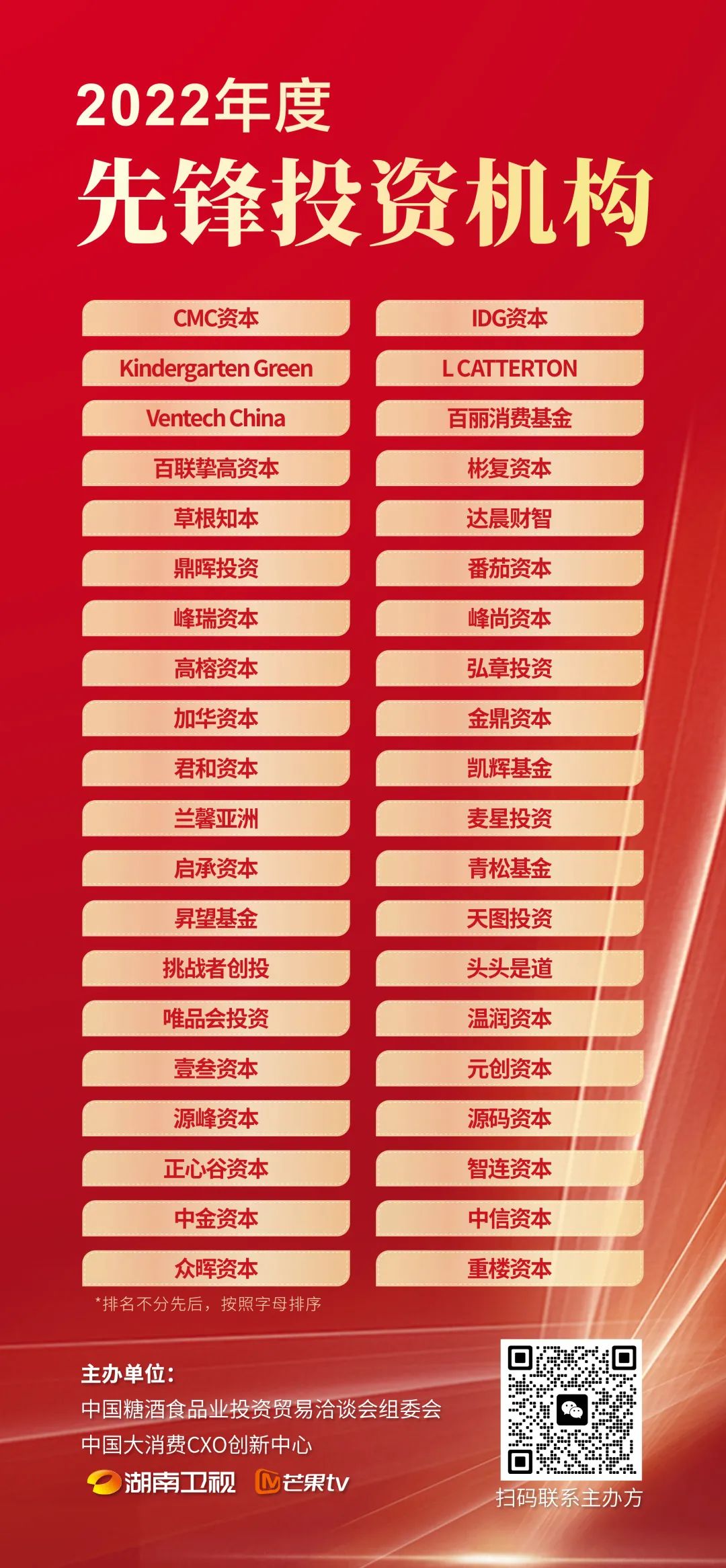 获得“2022年度先锋投资机构”奖项的分别是:CMC资本、IDG资本、Kindergarten Green、L CATTERTON、Ventech China、百丽消费基金、百联挚高资本、彬复资本、草根知本、达晨财智、鼎晖投资、番茄资本、峰瑞资本、高榕资本、弘章投资、加华资本、金鼎资本、君和资本、凯辉基金、兰馨投资、麦星投资、启承资本、青松基金、昇望基金、天图投资、挑战者创投、头头是道、唯品会投资、温润资本、壹叁资本、元创资本、源峰资本、源码资本、正心谷资本、智连资本、中金资本、中信资本、众晖资本、重楼资本。