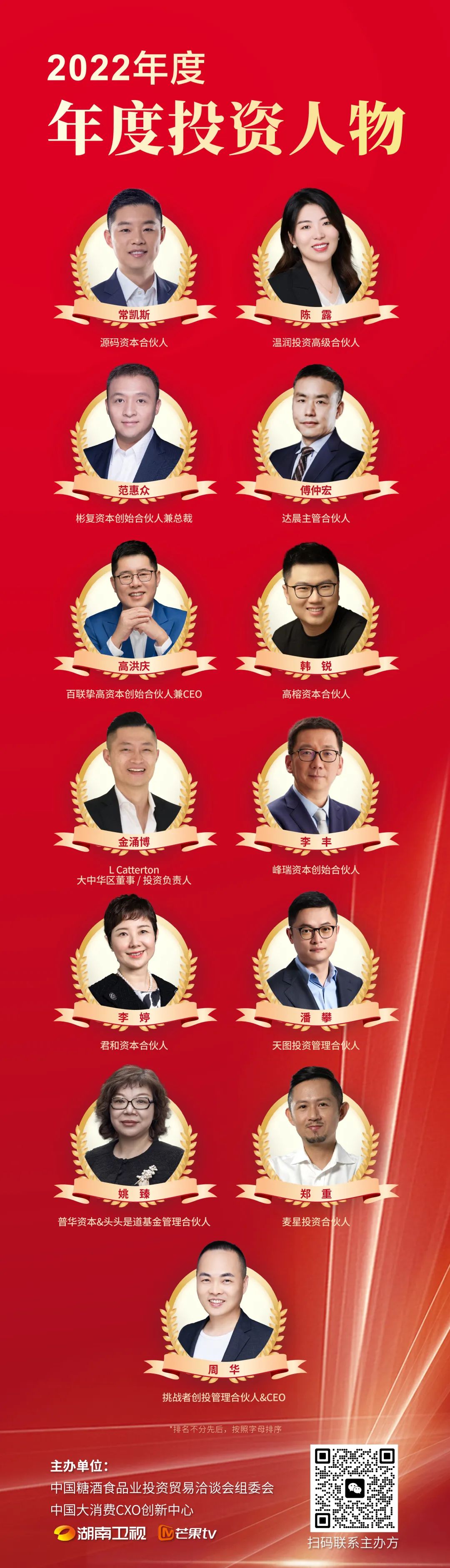 获得“2022年度投资人物”奖项的分别是:源码资本合伙人常凯斯、温润投资高级合伙人陈露、彬复资本创始合伙人兼总裁范惠众、达晨主管合伙人傅仲宏、百联挚高资本创始合伙人兼CEO高洪庆、高榕资本合伙人韩锐、L Catterton大中华区董事/投资负责人金涌博、峰瑞资本创始合伙人李丰、君和资本合伙人李婷、天图投资管理合伙人潘攀、普华资本&头头是道基金管理合伙人姚臻、麦星投资合伙人郑重、挑战者创投管理合伙人周华。