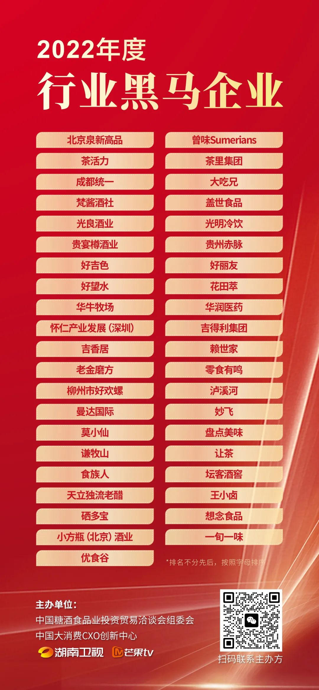 获得“2022年度行业黑马企业”奖项的分别是:北京泉新高品、 曾味Sumerians、茶活力、茶里集团、成都统一、大吃兄、梵酱酒社、盖世食品、光良酒业、光明冷饮、贵宴樽酒业、贵州赤脉、好吉色、好丽友、好望水、花田萃、华牛牧场、华润医药、怀仁产业发展(深圳) 、吉得利集团、吉香居、赖世家、老金磨方、零食有鸣、柳州市好欢螺、泸溪河、曼达国际、妙飞、莫小仙、盘点美味、谦牧山、让茶、食族人、坛客酒窖、天立独流老醋、王小卤、硒多宝、想念食品、小方瓶(北京)酒业、一旬一味、优食谷。