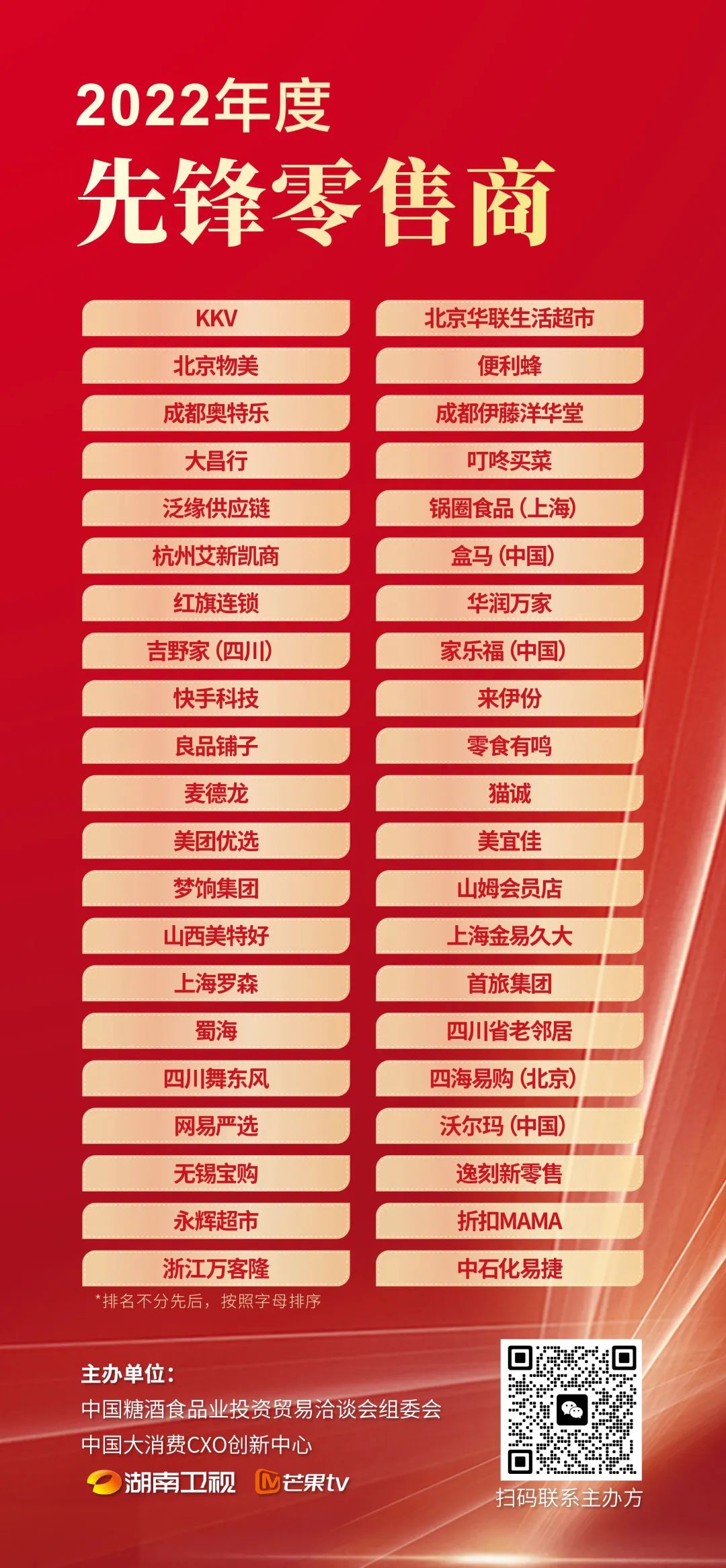 获得“2022年度先锋零售商”奖项的分别是:KKV、北京华联生活超市、北京物美、便利蜂、成都奥特乐、成都伊藤洋华堂、大昌行、叮咚买菜、泛缘供应链、锅圈食品(上海)、杭州艾新凯商、盒马(中国)、红旗连锁、华润万家、吉野家(四川)、家乐福(中国)、快手科技、来伊份、良品铺子、零食有鸣、麦德龙、猫诚、美团优选、美宜佳、梦饷集团、山姆会员店、山西美特好、上海金易久大、上海罗森、首旅集团、蜀海、四川省老邻居、四川舞东风、四海易购(北京)、网易严选、沃尔玛(中国)、无锡宝购、逸刻新零售、永辉超市、折扣MAMA、浙江万客隆、中石化易捷。