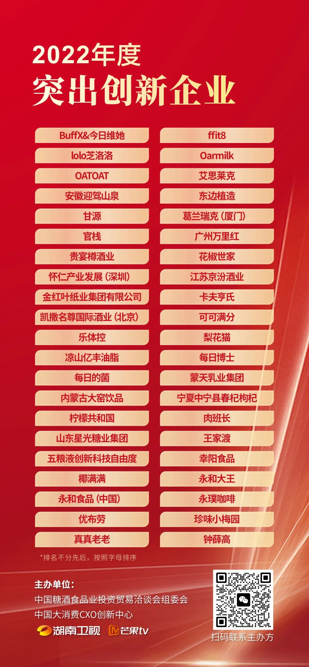 获得“2022年度突出创新企业”奖项的分别是:BuffX&今日维她、ffit8、lolo芝洛洛、Oarmilk、OATOAT、艾思莱克、安徽迎驾山泉、东边植造、甘源、葛兰瑞克(厦门) 、官栈、广州万里红、贵宴樽酒业、花椒世家、怀仁产业发展(深圳) 、江苏京汾酒业、金红叶纸业集团有限公司、卡夫亨氏、凯撒名尊国际酒业(北京) 、可可满分、乐体控、梨花猫、凉山亿丰油脂、每日博士、每日的菌、蒙天乳业集团、内蒙古大窑饮品、宁夏中宁县春杞枸杞、柠檬共和国、肉班长、山东星光糖业集团、王家渡、五粮液创新科技自由度、幸阳食品、椰满满、永和大王、永和食品(中国)、永璞咖啡、优布劳、珍味小梅园、真真老老、钟薛高。