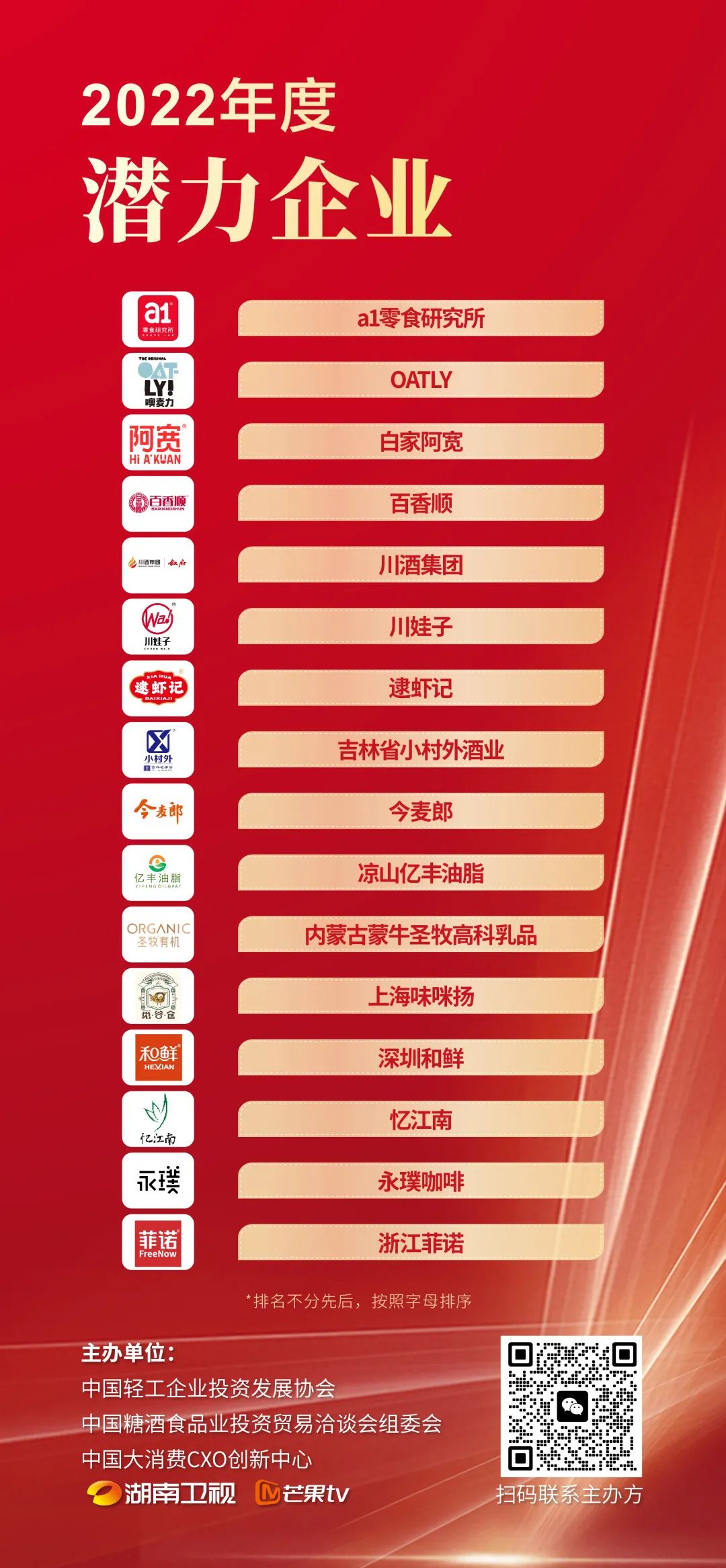 获得“2022年度潜力企业”奖项的分别是:a1零食研究所、OATLY、白家阿宽、百香顺、川酒集团、川娃子、逮虾记、吉林省小村外酒业、今麦郎、凉山亿丰油脂、内蒙古蒙牛圣牧高科乳品、上海味咪扬、深圳和鲜、忆江南、永璞咖啡、浙江菲诺。