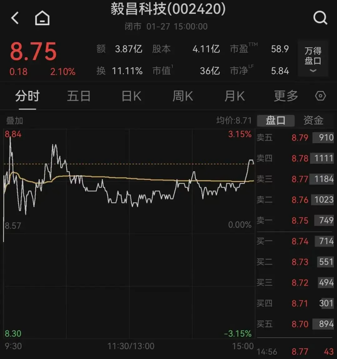截至1月27日收盘,毅昌科技涨2.1%,报8.75元/股,总市值为36亿元。